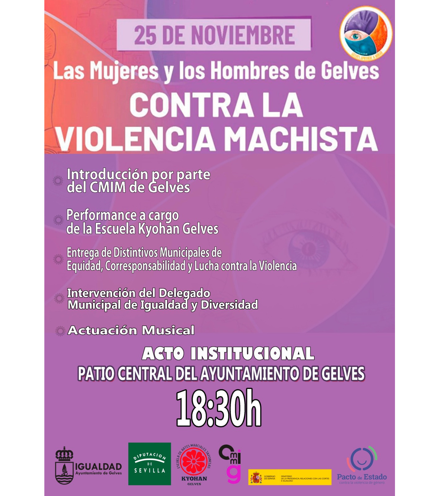 Bajo el eslogan "Las Mujeres y Hombres de Gelves contra la Violencia Machista", incluirá una performance a cargo de la Escuela Kyohan Gelves, la entrega de Distintivos Municipales de Equidad, Corresponsabilidad y Lucha contra la Violencia y la intervención del Delegado Municipal de Igualdad y Diversidad, finalizando con una Actuación Musical a cargo de Lucía Campos.