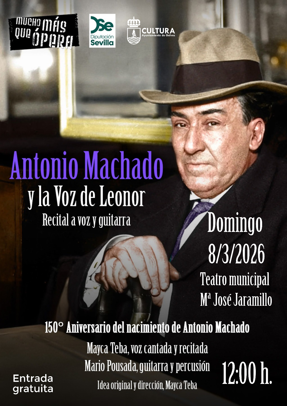 El Ayuntamiento de Gelves, a través de su Delegación de Cultura, ofrece el próximo 8 de marzo a las 12:00 horas en el Teatro Municipal Mª José Jaramillo Ramírez el recital “Antonio Machado, la voz de Leonor”, una propuesta escénico-musical que conmemora el 150º aniversario del nacimiento de este poeta andaluz.