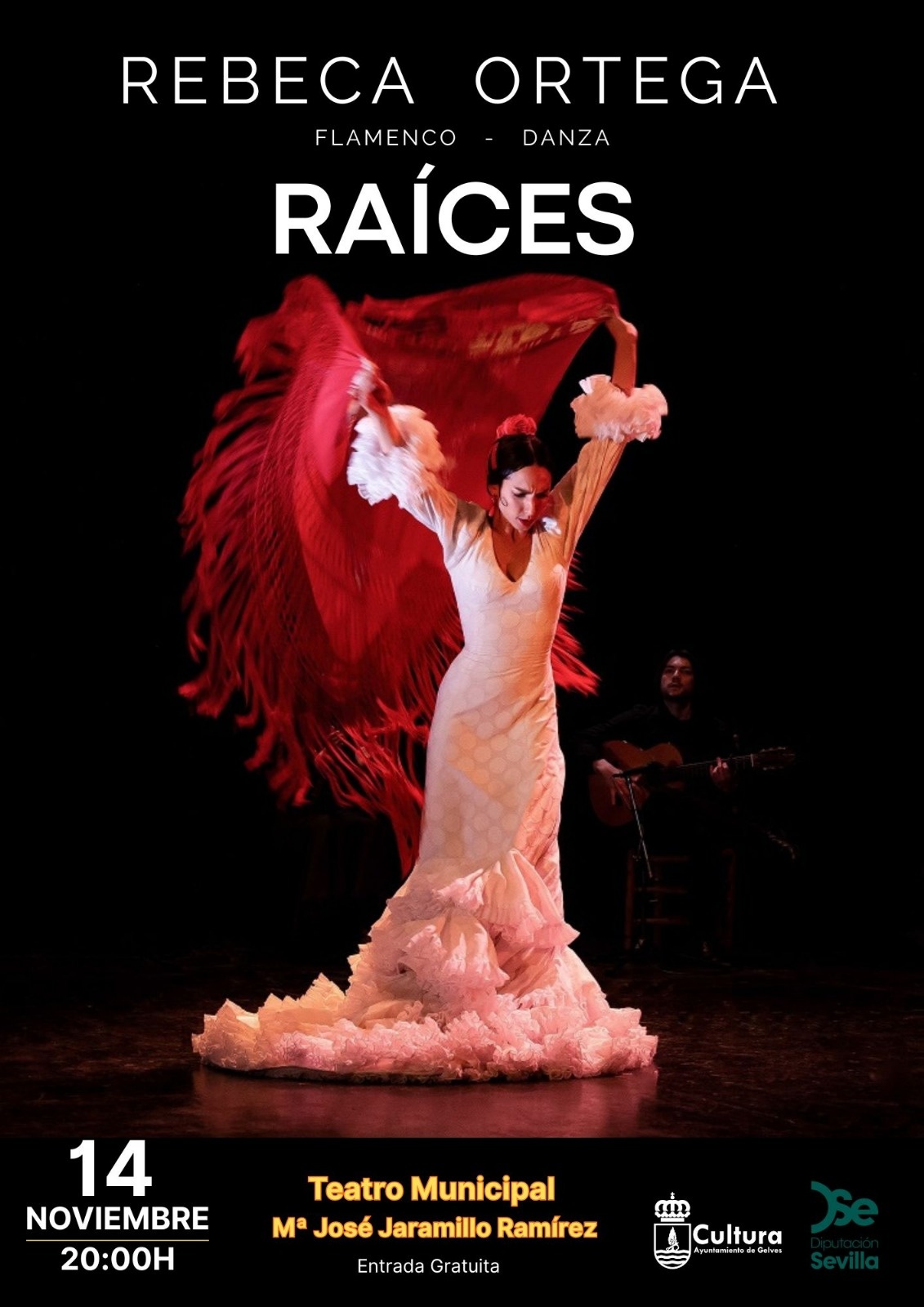 El próximo 14 de noviembre de 2025 a las 20:00 h, el Teatro Municipal Mª José Jaramillo Ramírez acogerá Raíces, el nuevo espectáculo de Rebeca Ortega, una propuesta de flamenco y danza que reivindica el poder creador y transformador de las mujeres. La entrada será gratuita, en una actividad promovida por el Área de Cultura del Ayuntamiento de Gelves con la colaboración de la Diputación de Sevilla.