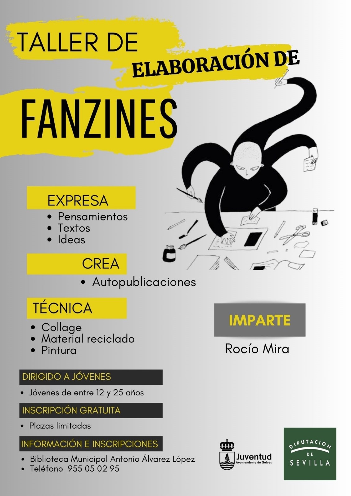 La Delegación de Cultura del Ayuntamiento de Gelves ha organizado un Taller de Elaboración de Fanzines para jóvenes de entre 12 y 25 años. La inscripción es gratuita y se desarrollará en la Biblioteca Municipal de Gelves “Antonio Álvarez López”.