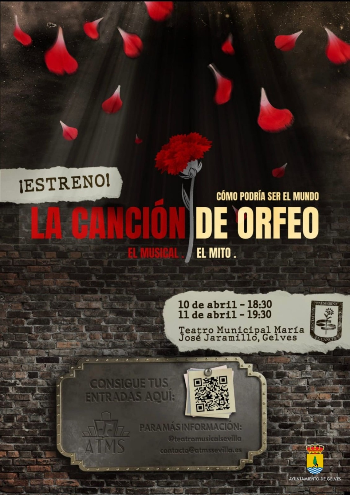 El Ayuntamiento de Gelves, a través de su Delegación de Cultura, informa a la ciudadanía del próximo espectáculo que acogerá el Teatro Municipal Mª José Jaramillo Ramírez: “La canción de Orfeo”. Una propuesta de la Asociación de Teatro Musical de Sevilla, ATMS, que invita al público a sumergirse en una historia cargada de simbolismo, emoción y compromiso social. Las funciones tendrán lugar los días 10 de abril, a las 18:30 horas, y 11 de abril, a las 19:30 horas.