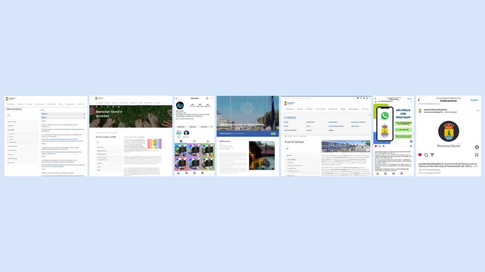 Entre los contenidos renovados recientemente en la web municipal www.gelves.es se encuentran los apartados de: corporación municipal, ordenanzas, delegaciones municipales y grupos políticos. También se han creado contenidos nuevos como el apartado de hemeroteca (artículos sobre Gelves publicados en otros medios de comunicación externos) y el Punto Visible LGTBI (información especialmente útil para este colectivo). Además se están revisando los contenidos en las web de Ahora Radio y Puerto Gelves, el blog de Turismo, e incorporando nuevas imágenes, logotipos y piezas audiovisuales en las diferentes redes sociales municipales.