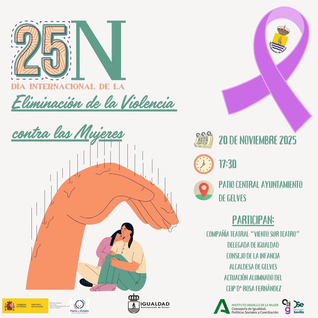 El Ayuntamiento de Gelves, a través de su Delegación de Igualdad y Diversidad y el Centro Municipal de Información a la Mujer (CMIM), ha organizado un acto institucional con motivo del 25 de noviembre, Día Internacional de la Eliminación de la Violencia contra las Mujeres 2025.