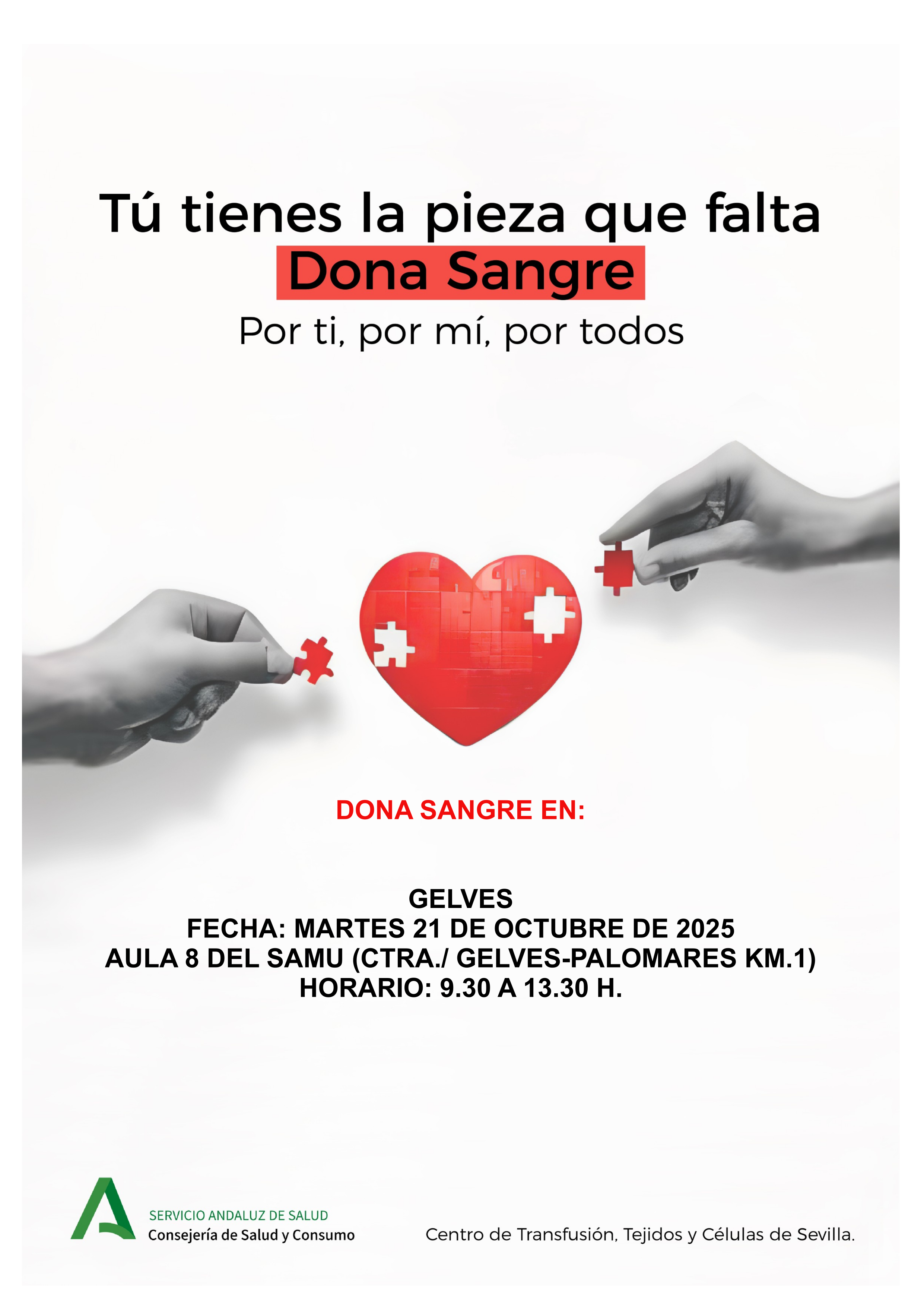 Será en horario de 9:30 a 13:30h se necesita sangre de todos los grupos. Colabora el SAMU de Gelves.