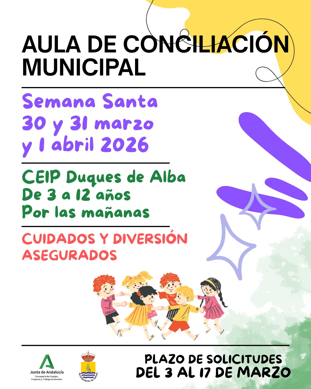 El plazo de solicitudes será del 3 al 17 de marzo. Deberán ir acompañadas de la documentación acreditativa de la situación familiar particular y presentarlas preferentemente de forma telemática a través de la sede electrónica del Ayuntamiento o en su Registro General de forma presencial. #gelves2026 #bienestarsocial #aulaconciliación #semanasanta