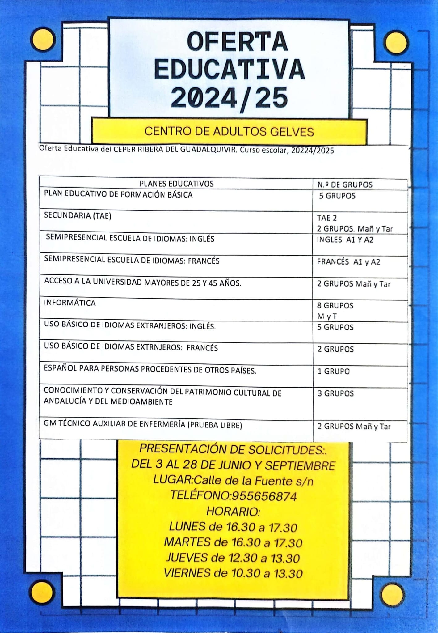 El Centro de Educación de Personas Adultas de Gelves, perteneciente al CEPER Ribera del Guadalquivir de Coria del Río, recuerda que se encuentra abierto el plazo de inscripciones para el próximo curso 2024-25. La amplia oferta formativa contempla desde la obtención del plan educativo de formación básica hasta el acceso a la Universidad para personas mayores de 25 y 45 años, niveles básicos de varios idiomas extranjeros, o del español para personas de otros países.