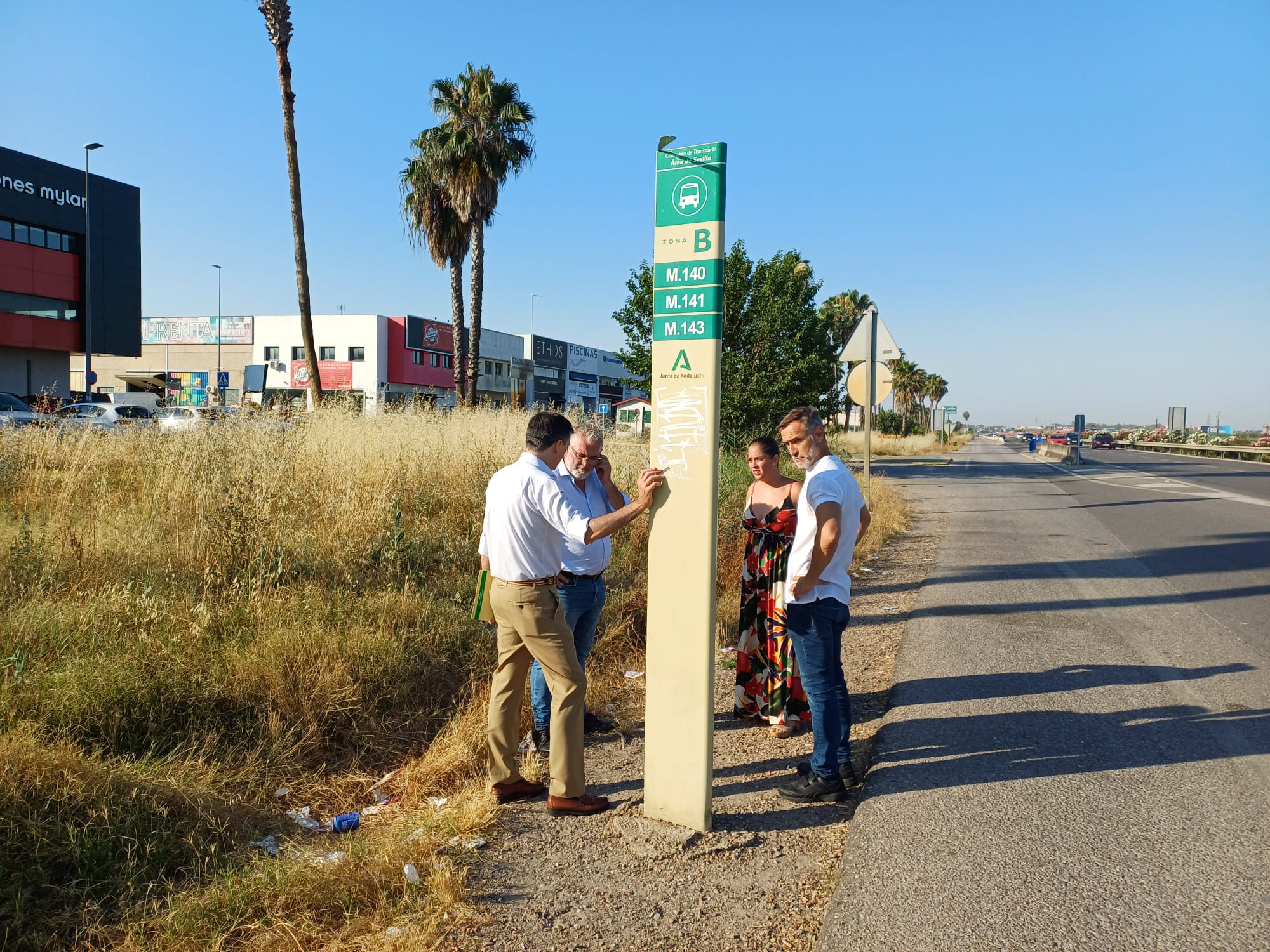 El delegado de Seguridad Ciudadana del Ayuntamiento de Gelves, Rafael G. Villa, y la delegada municipal de Urbanismo y Medioambiente, Sandra Domínguez, se reunieron la semana pasada con el director de Área del Consorcio de Transporte Metropolitano del Área de Sevilla, Francisco Ramos, para mostrarle in situ la necesidad de dar solución definitivamente a las paradas de bus de los polígonos industriales de la localidad. Concretamente, la petición ha sido, de nuevo, dotar con marquesina a la ya existente en el PIS Guadalquivir, además, se ha solicitado crear una nueva parada cercana a la rotonda que da acceso a CITEC.
