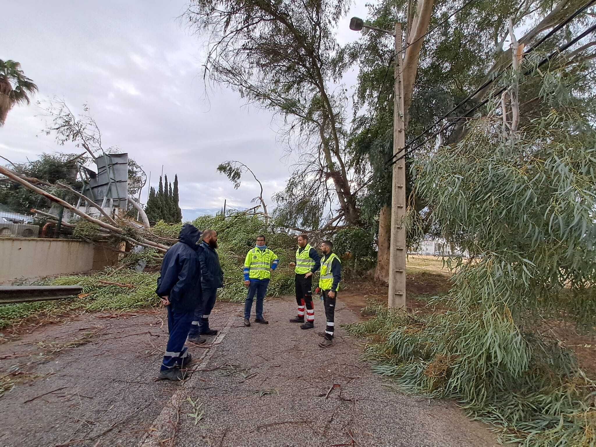 Además de cerrar al público parques y otras instalaciones municipales, tanto los operarios como los agentes de Policía Local estuvieron ayer señalizando los puntos de peligro y atendiendo las situaciones priorizando las urgencias. Entre estos puntos se encuentran la caída de árboles en la barriada Andalucía, urbanización Soto Alto, Marina Gelves, calle Acebuche y calle Jándula.