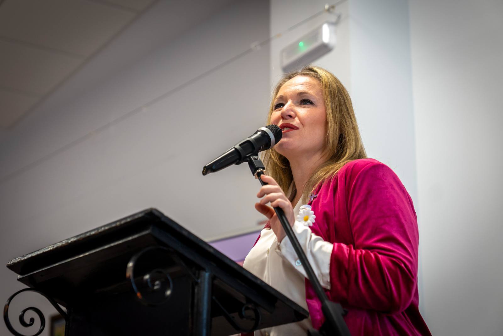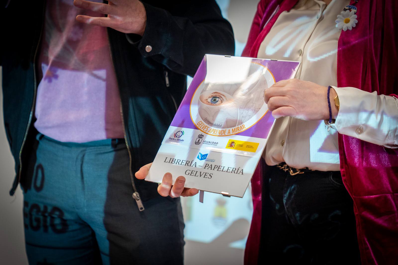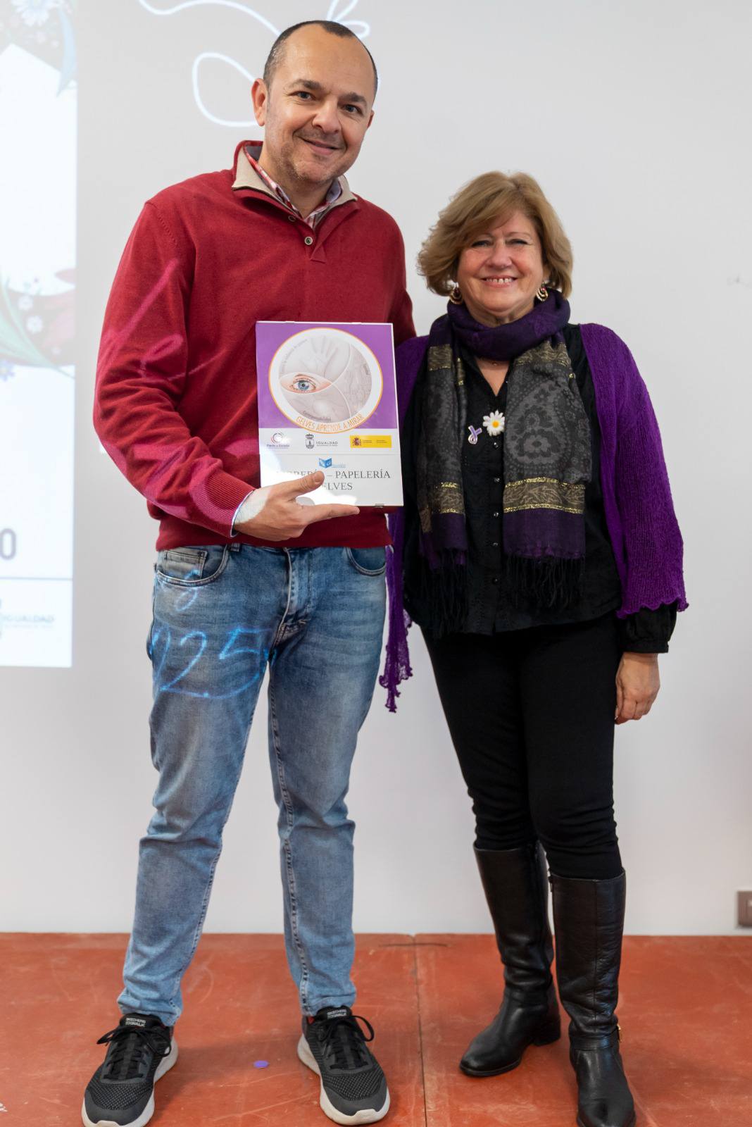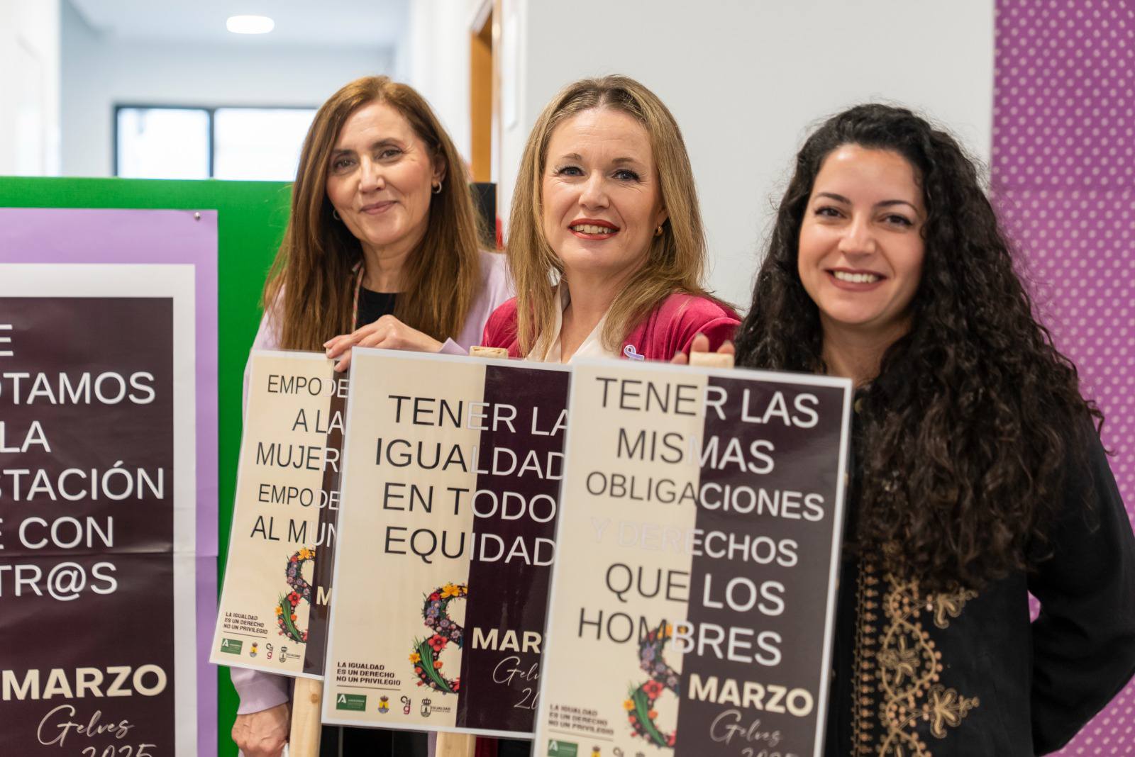 El acto comenzó con el discurso de Mariló González, delegada de Igualdad, quién por su parte, hizo un repaso por toda la problemática que afecta a las mujeres en la actualidad, y les brindó su apoyo y el de las instituciones para seguir consiguiendo sus metas de igualdad. Seguidamente se hizo entrega del Distintivo por la Equidad, la Corresponsabilidad y Contra la Violencia de Género, presentado por el citado delegado de Bienestar Social, Pablo Cordero. Distintivo que este año se entregaba por parte de la alcaldesa al negocio local "Librería Papelería Gelves".