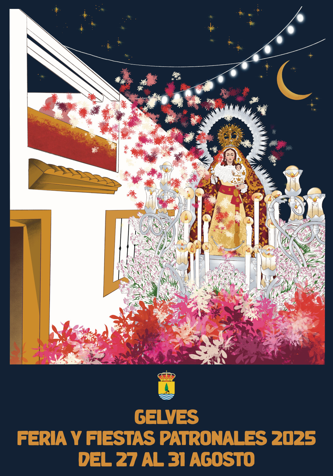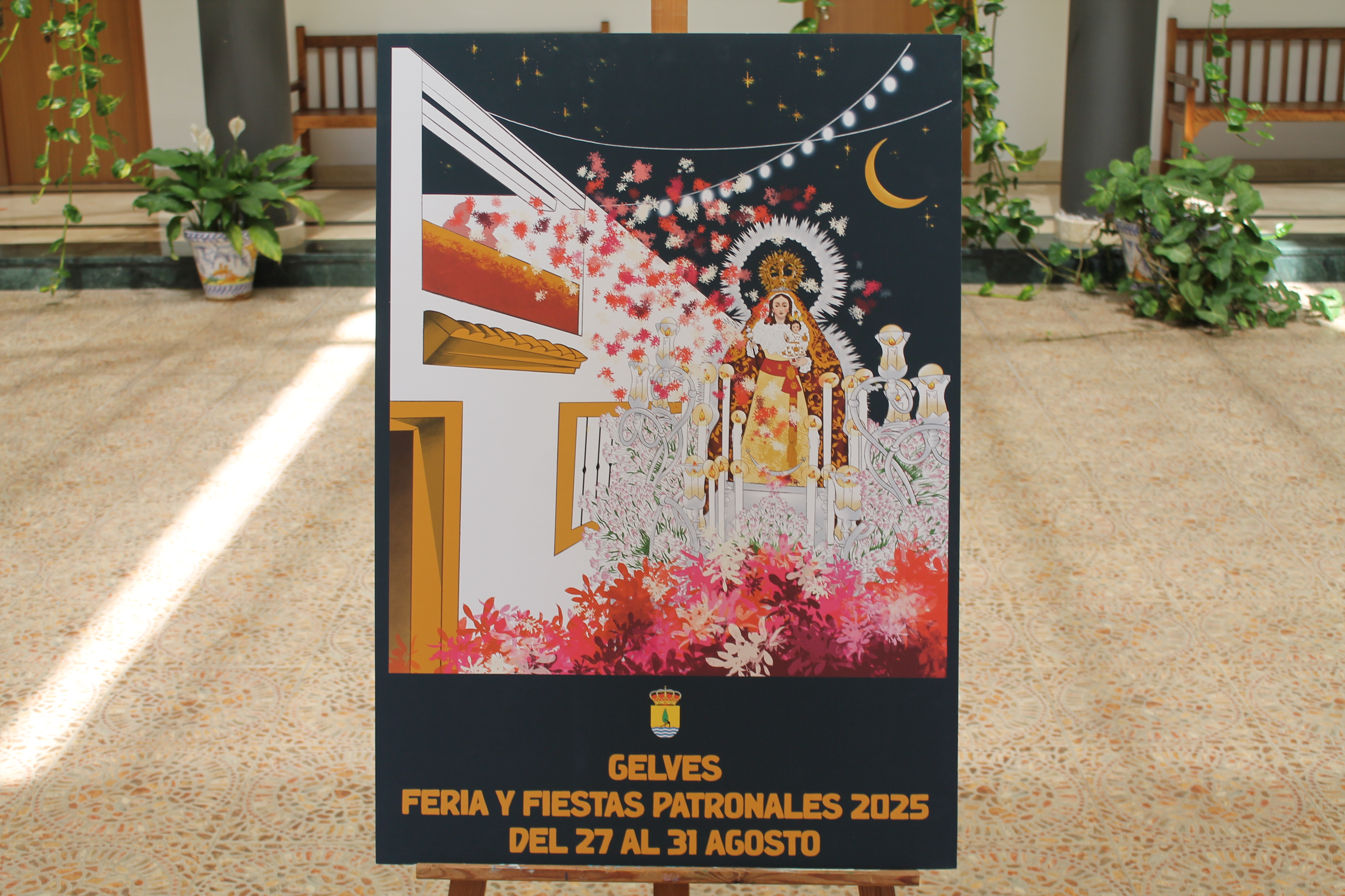La Feria y Fiestas Patronales de Gelves 2025, que se celebrarán en Gelves del 27 al 31 de agosto, ya tienen cartel anunciador. Es obra de la autora Mercedes Jiménez García, de familia gelveña que bajo nombre "Flores para la Virgen", ha resultado ganadora del concurso convocado por el Ayuntamiento para su elección. La obra elegida resalta a la Virgen de Gracia Coronada en procesión, patrona de la localidad en torno a la que se celebran estas fiestas, que aparece rodeada de elementos, rincones y una fuerte simbología que parece evocar a personas y tradiciones de la localidad en estas fiestas.