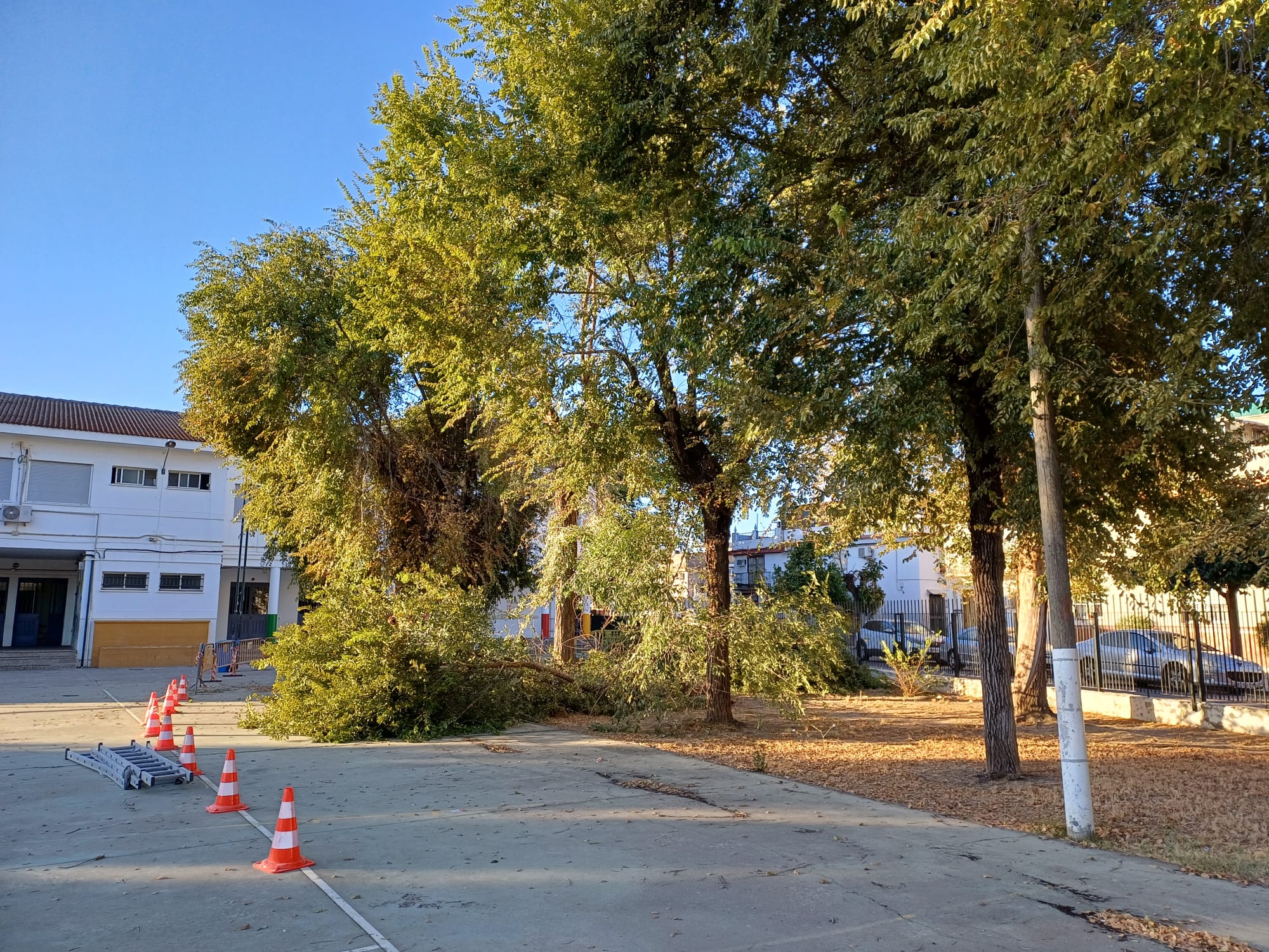 La Delegación de Servicios Públicos del Ayuntamiento de Gelves informa de que esta mañana han comenzado los trabajos de retirada de la arboleda enferma existente en el patio de infantil del CEIP Duques de Alba, ante el peligro que suponía tanto para el mobiliario como para las personas que habitualmente frecuentan este espacio, alumnado y profesorado especialmente.