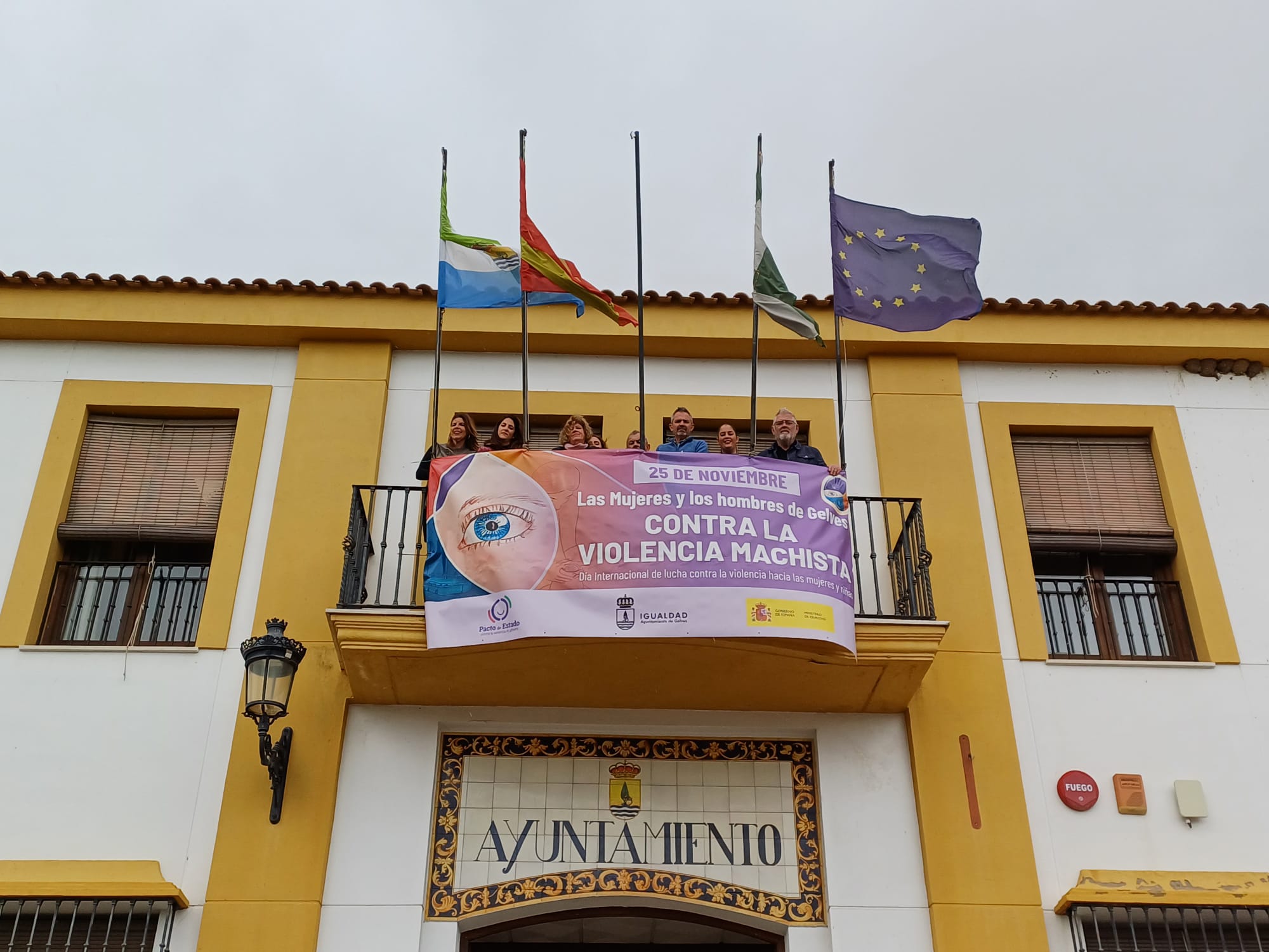 El Ayuntamiento de Gelves ha acogido esta mañana el acto institucional organizado por la Delegación Municipal de Igualdad y Diversidad, en colaboración con el CMIM de la localidad, con motivo del 25 de Noviembre, Día Internacional para la Eliminación de la Violencia de Género. El acto ha comenzado con el despliegue de una pancarta alusiva en el balcón principal del edificio en el que han participado miembros del equipo de gobierno, para seguir con el discurso de la alcaldesa.