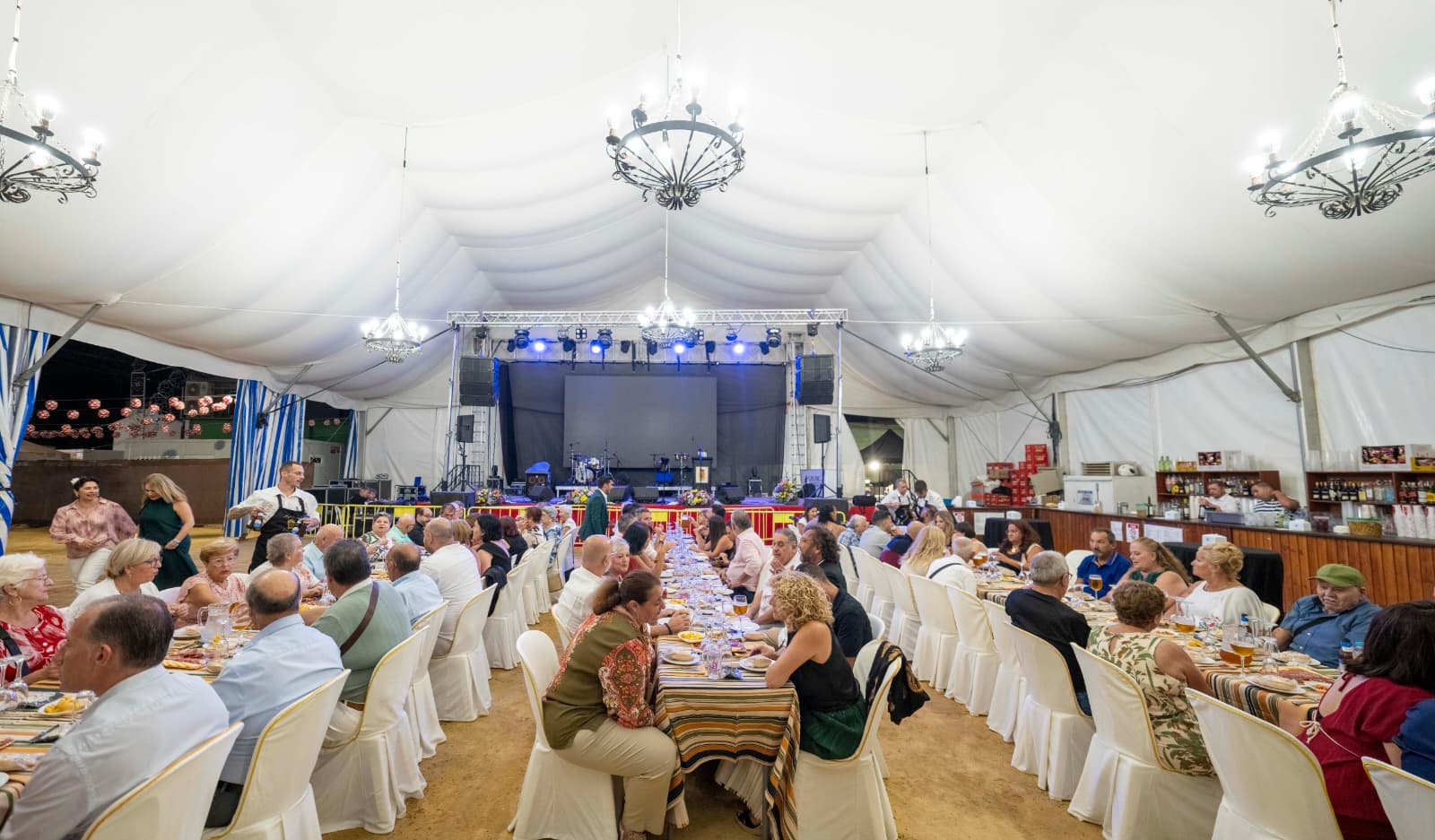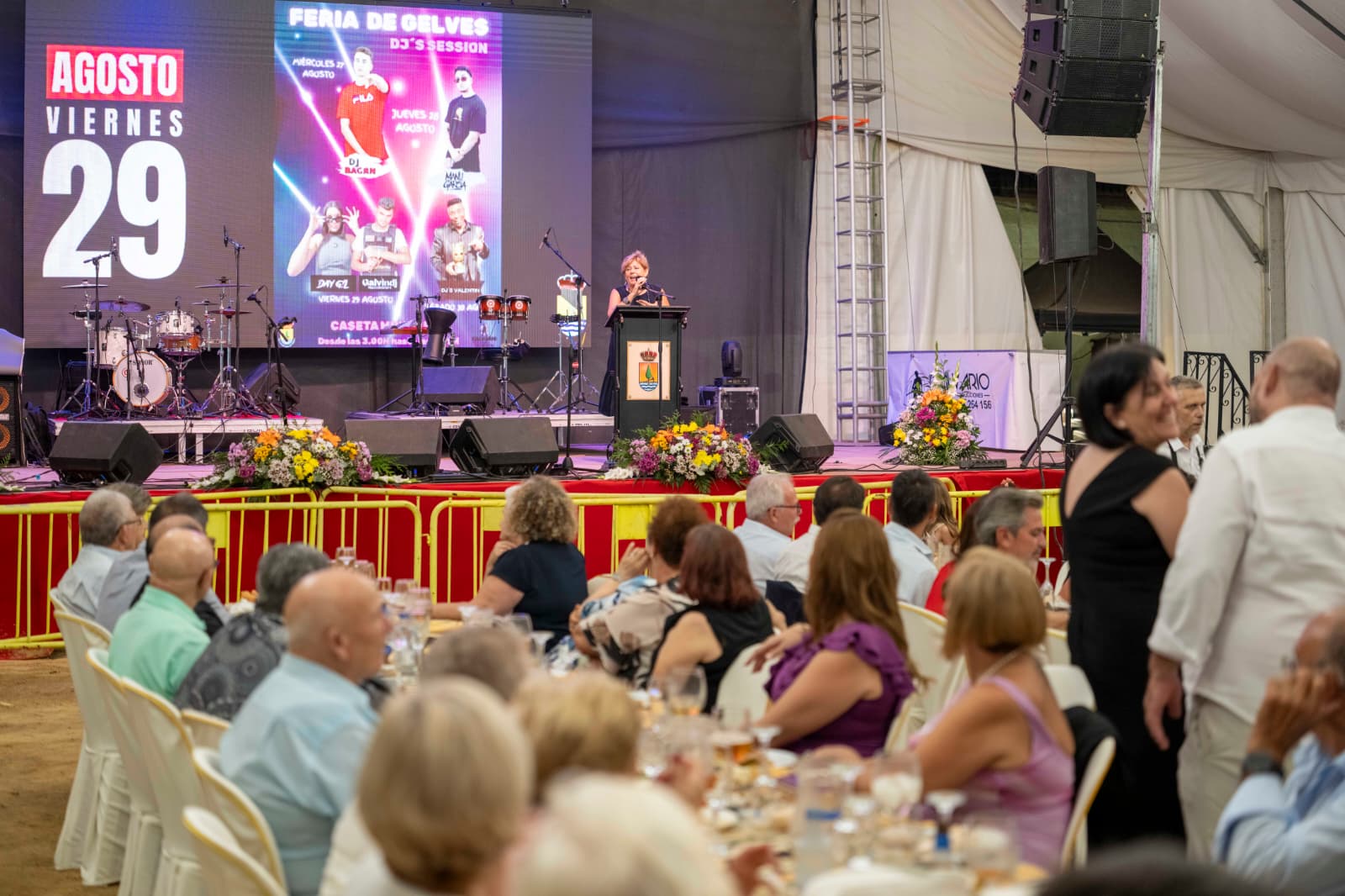 Una vez de vuelta a la caseta municipal, la alcaldesa regresó al escenario junto a su equipo de gobierno y el párroco para brindar con cava con todas las personas asistentes, deseándoles unas fiestas felices y seguras. En su mensaje final, apeló a la solidaridad y a la paz, recordando que “es el amor el que mueve el mundo y puede acabar con las guerras”.