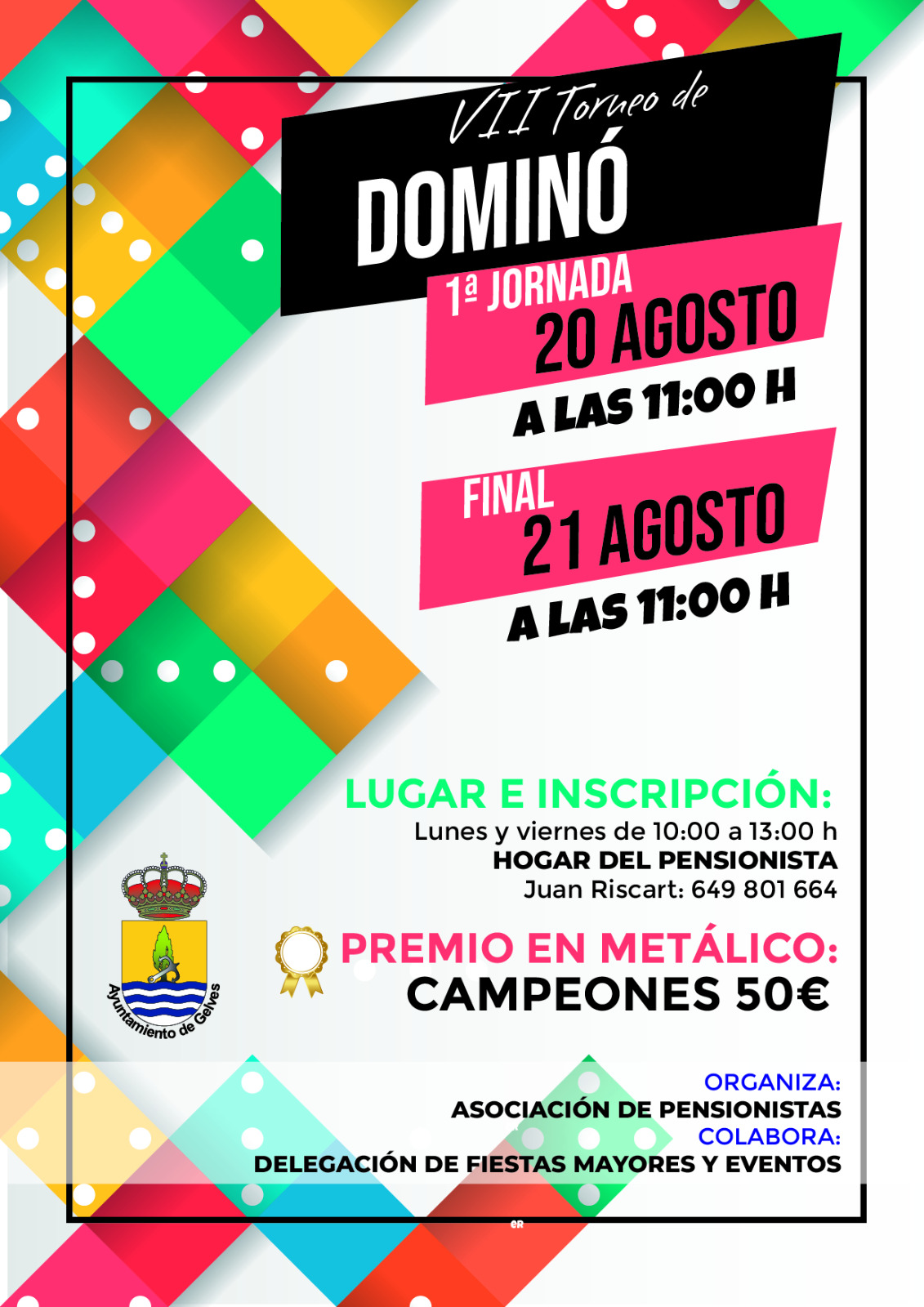 Por su parte el VII torneo de Dominó de celebrará entre los días 20 y 21 de agosto en horario de mañana, coincidiendo el día 20 con el concurso de Dulces a las 18:30 horas y el día 21 con el concurso de Sevillanas a las 21:00 horas.