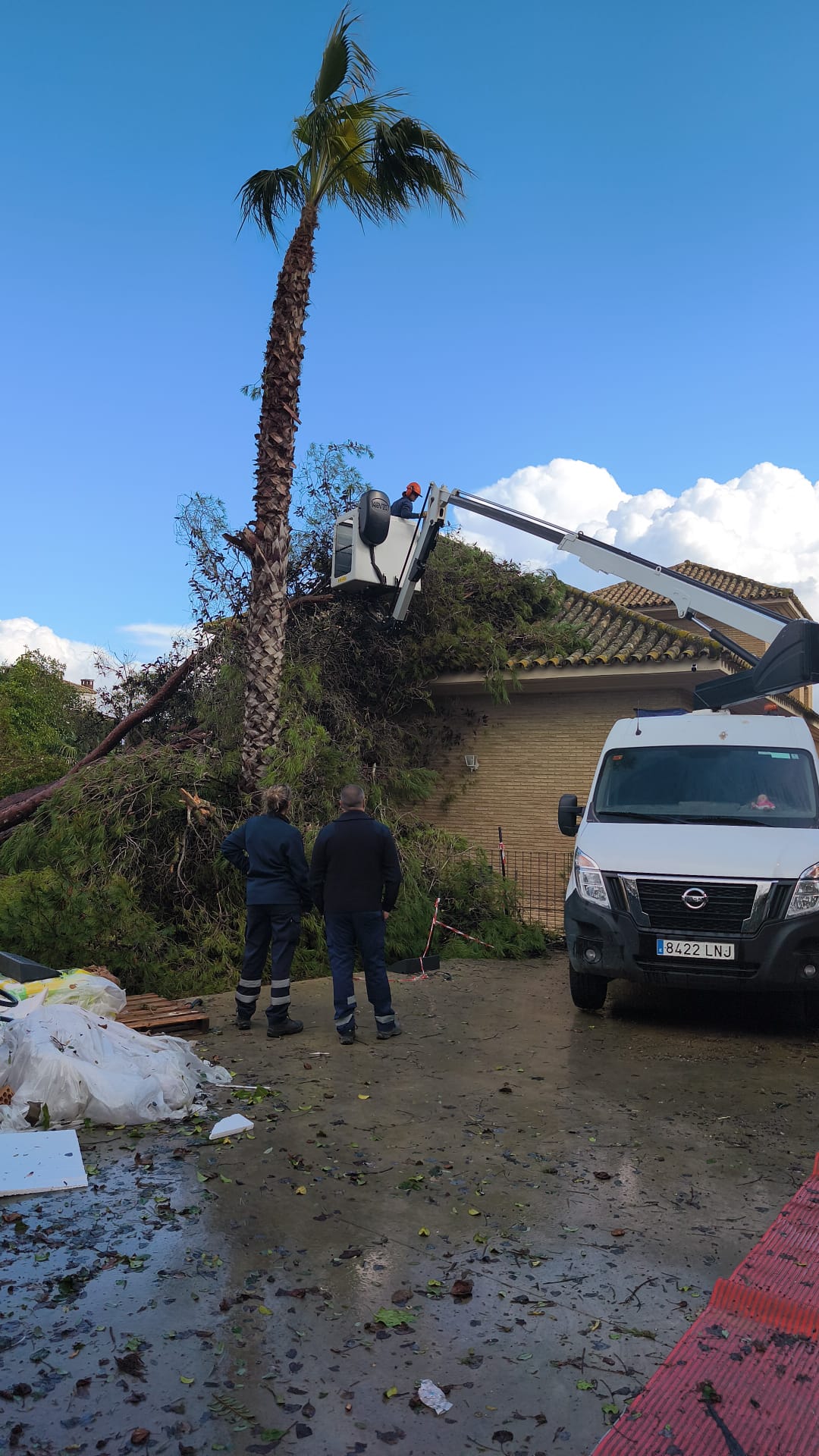 Los servicios municipales, tanto la plantilla de Servicios Públicos como el personal de las empresas contratadas por el Consistorio (jardinería, poda y limpieza viaria), trabajan a destajo para solventar estas incidencias. Mientras que ayer las actuaciones se centraron principalmente en la retirada de ramas, árboles y objetos caídos a la vía pública y algunos edificios, priorizando la seguridad y el tráfico de vehículos y personas, durante la jornada de hoy se llevará a cabo una valoración de riesgos para seguir atendiendo los casos más urgentes.
