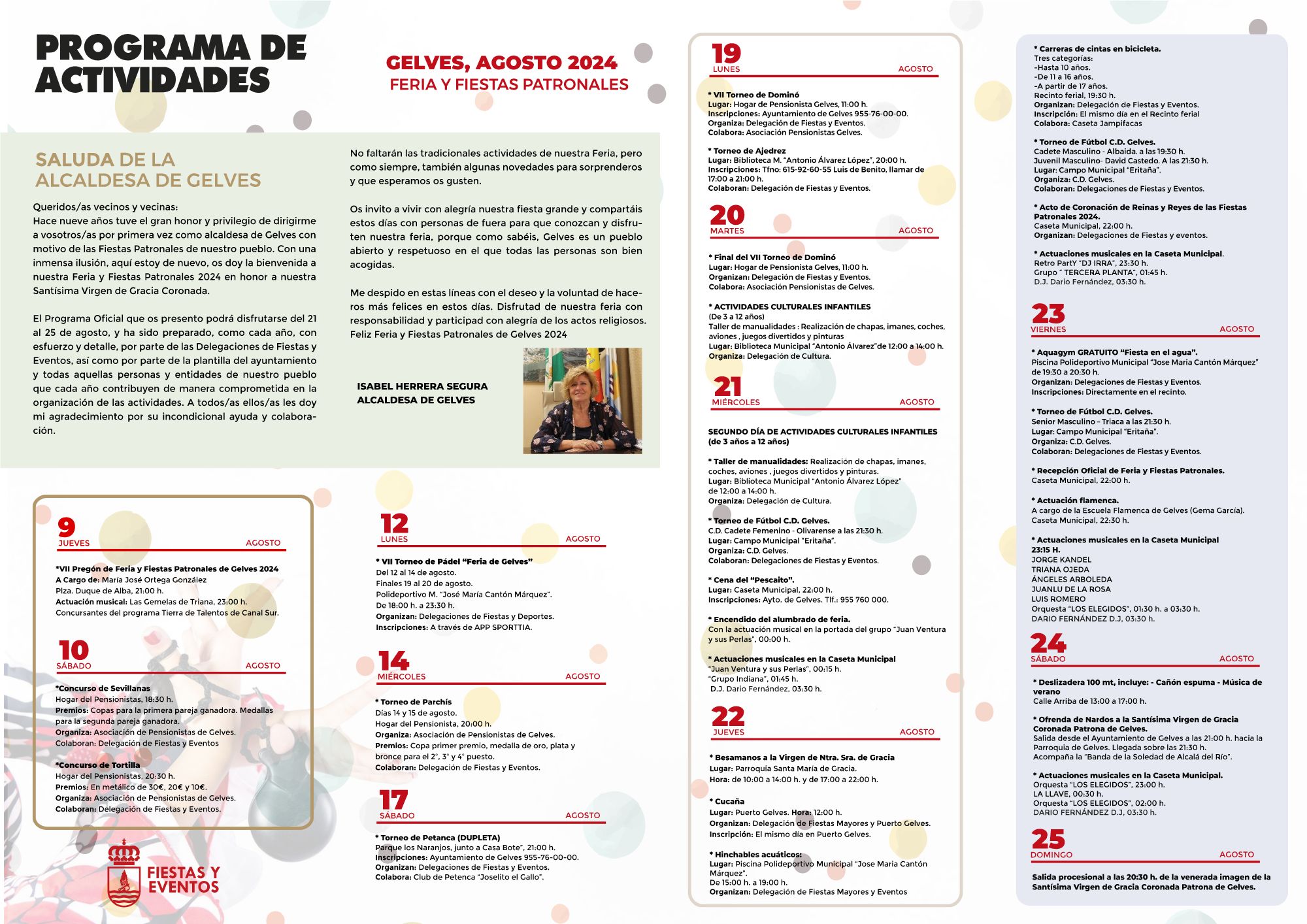 La alcaldesa, Isabel Herrera, invita a todos los vecinos y las vecinas a vivir con alegría nuestra fiesta grande, así como compartir estos días con todas las personas de dentro y fuera de nuestro pueblo, porque Gelves es un pueblo abierto y respetuoso en el que todas las personas son bien acogidas.