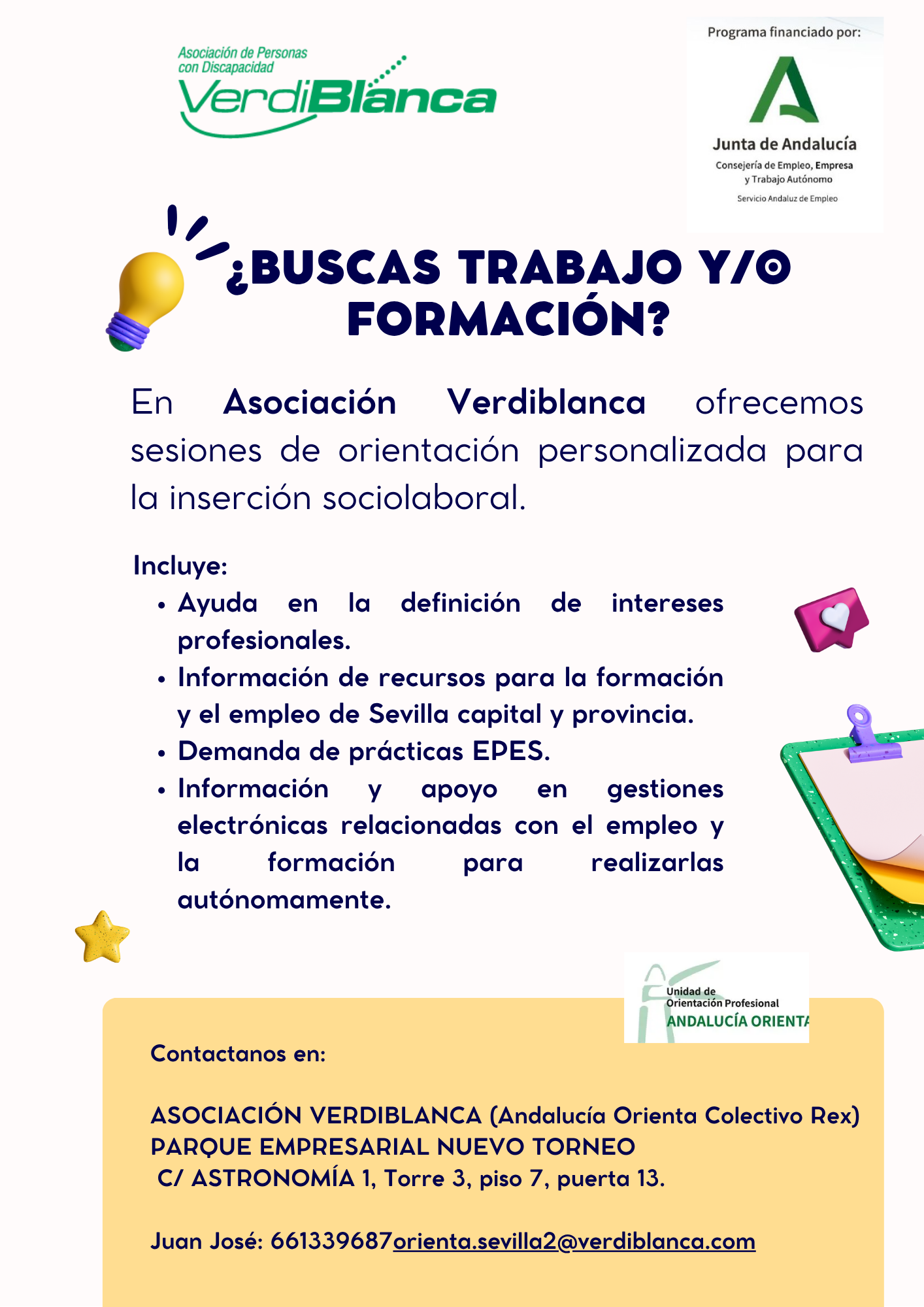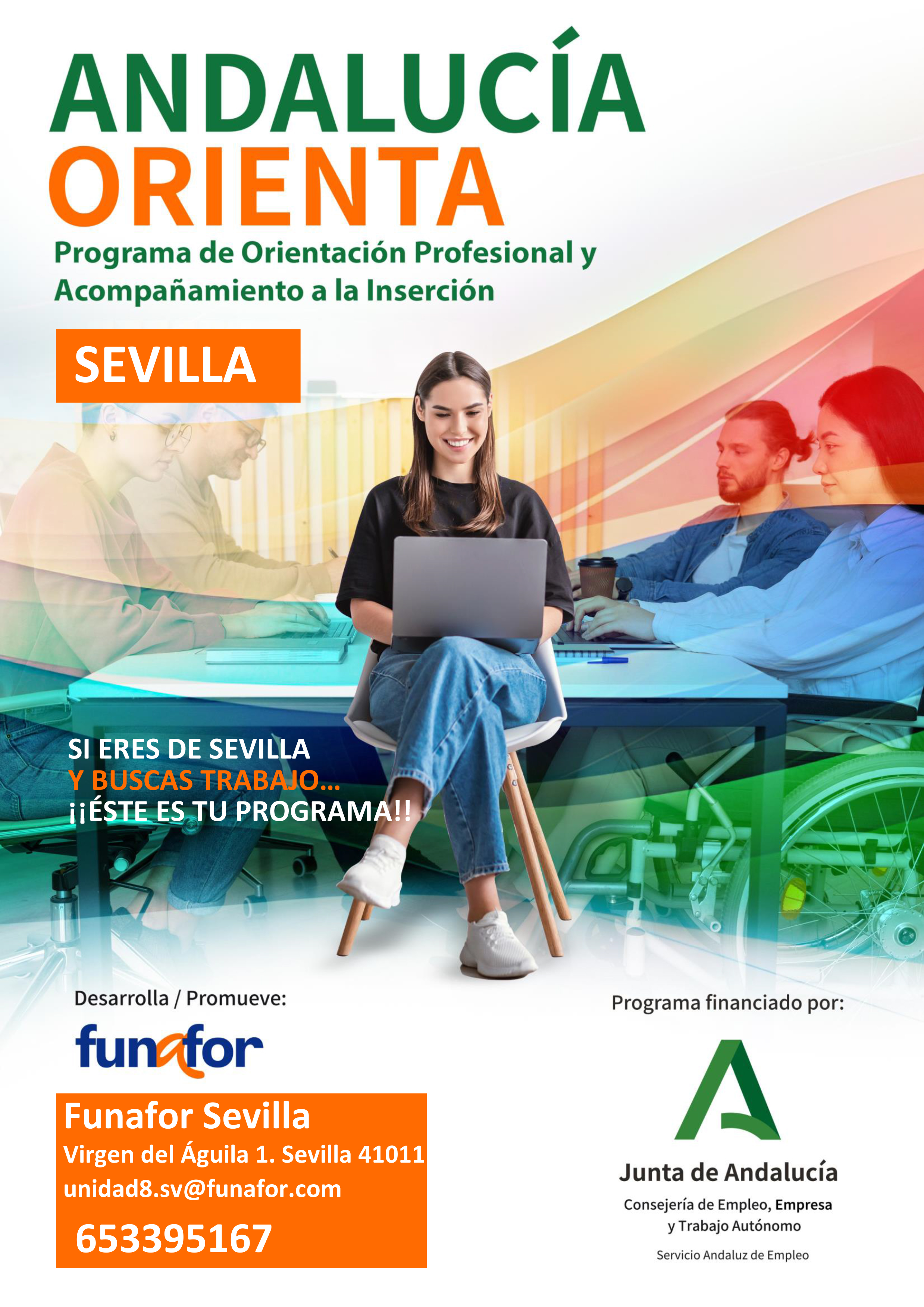 - FUNAFOR Sevilla: prestará orientación profesional y programas de inserción laboral dirigidos a personas con discapacidad física y/u orgánica, con atención semanal, los viernes de 9:00 a 14:00 horas.