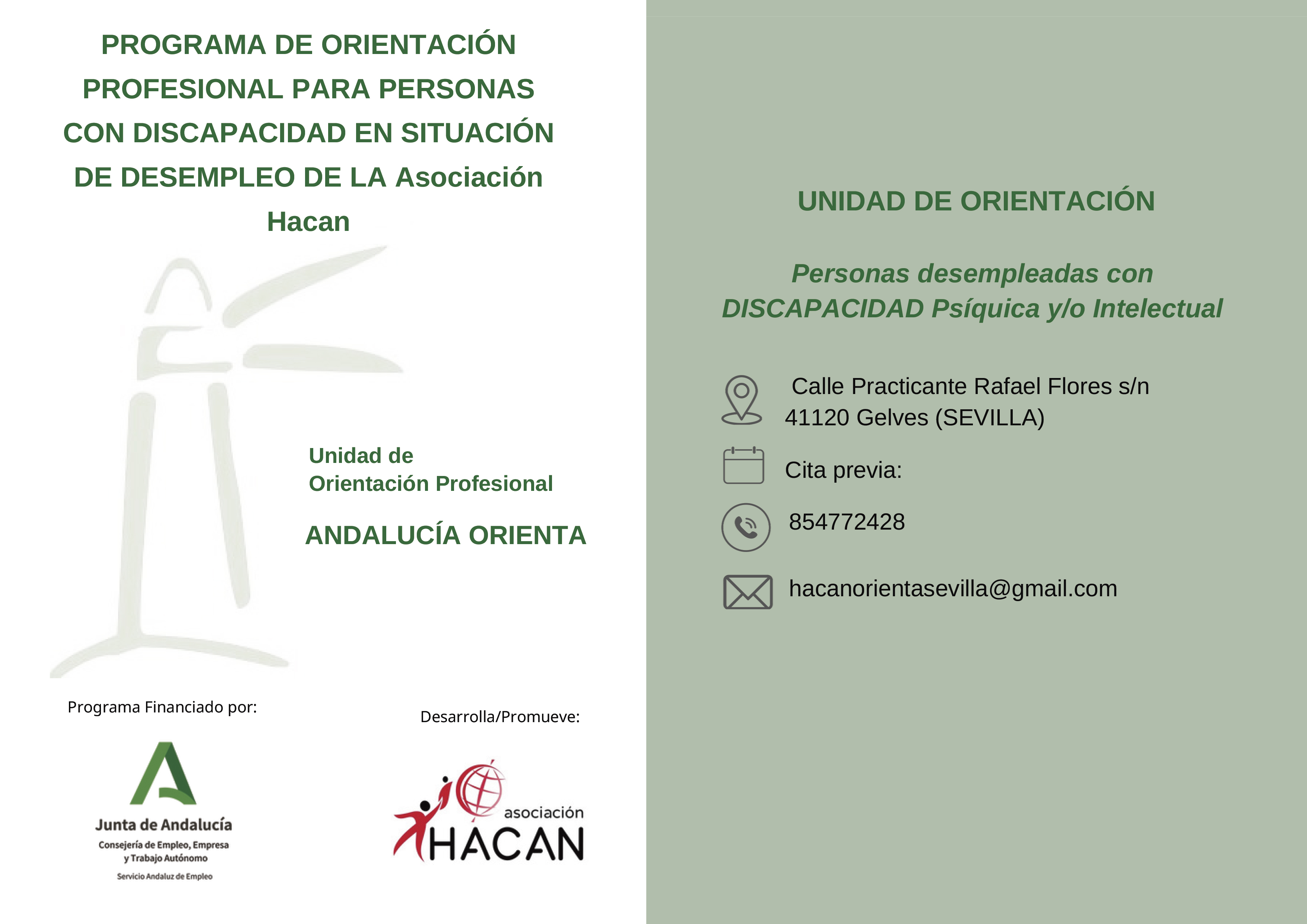 - Asociación HACAN: desarrollará orientación profesional y programas de inserción para personas con discapacidad psíquica e intelectual, con atención quincenal, los lunes de 9:00 a 14:00 horas.