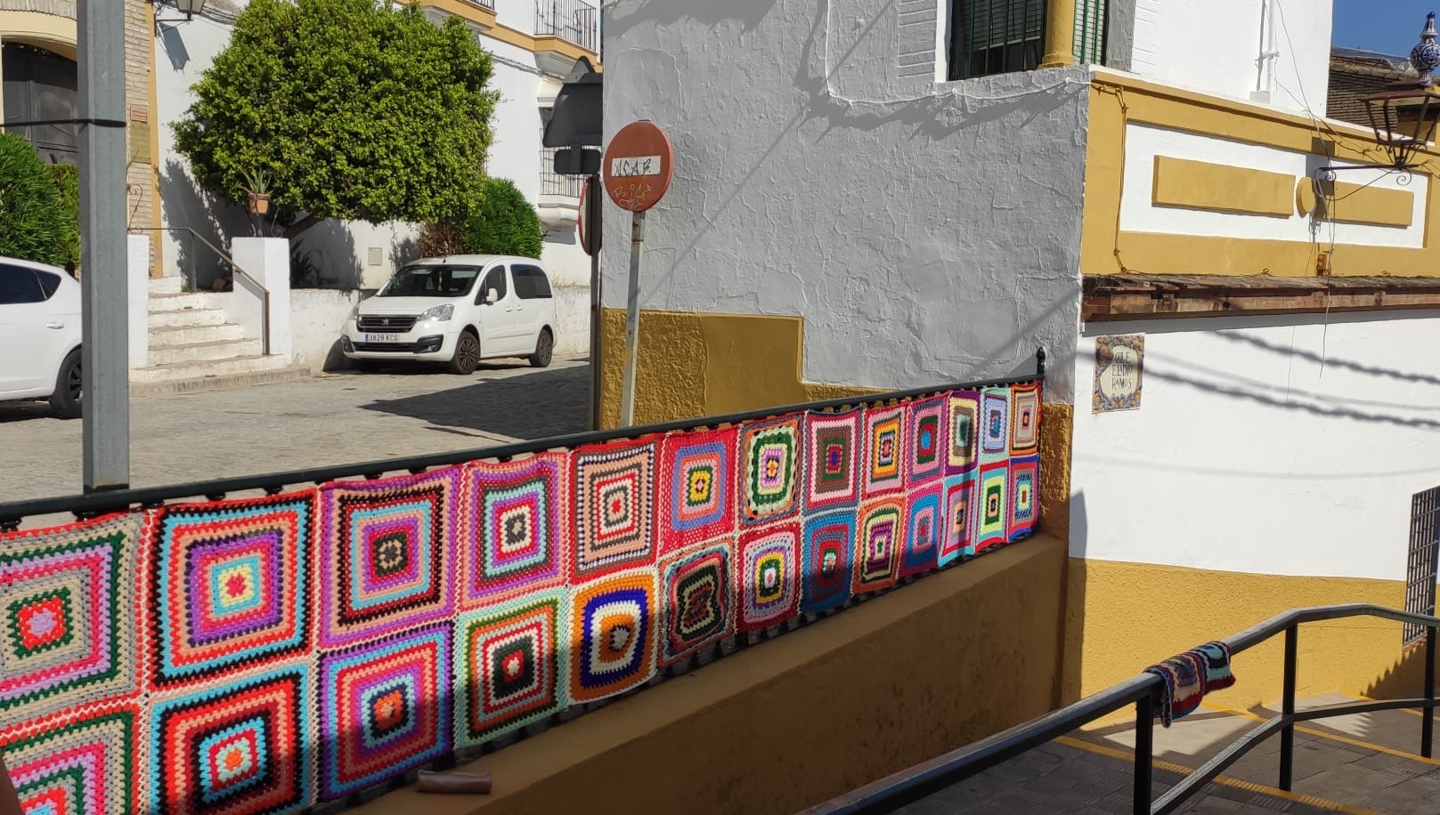Continuando con el Proyecto Gelves Teje, las mujeres tejedoras han decorado con mandalas en forma de cuadrado las rejas y barandilla de la calle Eladio Ramos así como la escalinata aledaña.
