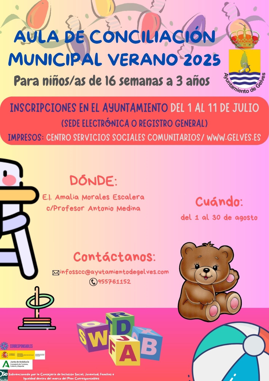 Este servicio gratuito se ofrecerá durante el mes de agosto en el Centro de Educación Infantil Municipal. Las familias interesadas podrán recoger sus solicitudes en el Centro de Servicios Sociales o descargarlas en www.gelves.es. La presentación se hará online a través de la Sede Electrónica o en el Registro General del Ayuntamiento de Gelves.