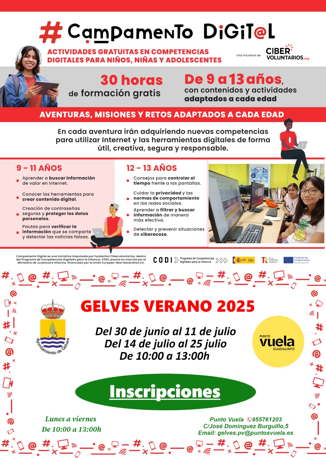 Gracias a un convenio con la Fundación Cibervoluntari@s.org, el Punto Vuela de Gelves (antiguo Centro Guadalinfo) ofrecerá este verano Campamentos Digitales para niños, niñas y adolescentes de 9 a 13 años. Unas actividades extraescolares gratuitas presenciales, en las que las personas participantes mejoran sus habilidades digitales de manera divertida y educativa; aprenden a navegar de forma segura por Internet; buscar información y crear su propio contenido digital; proteger su privacidad y usar las redes