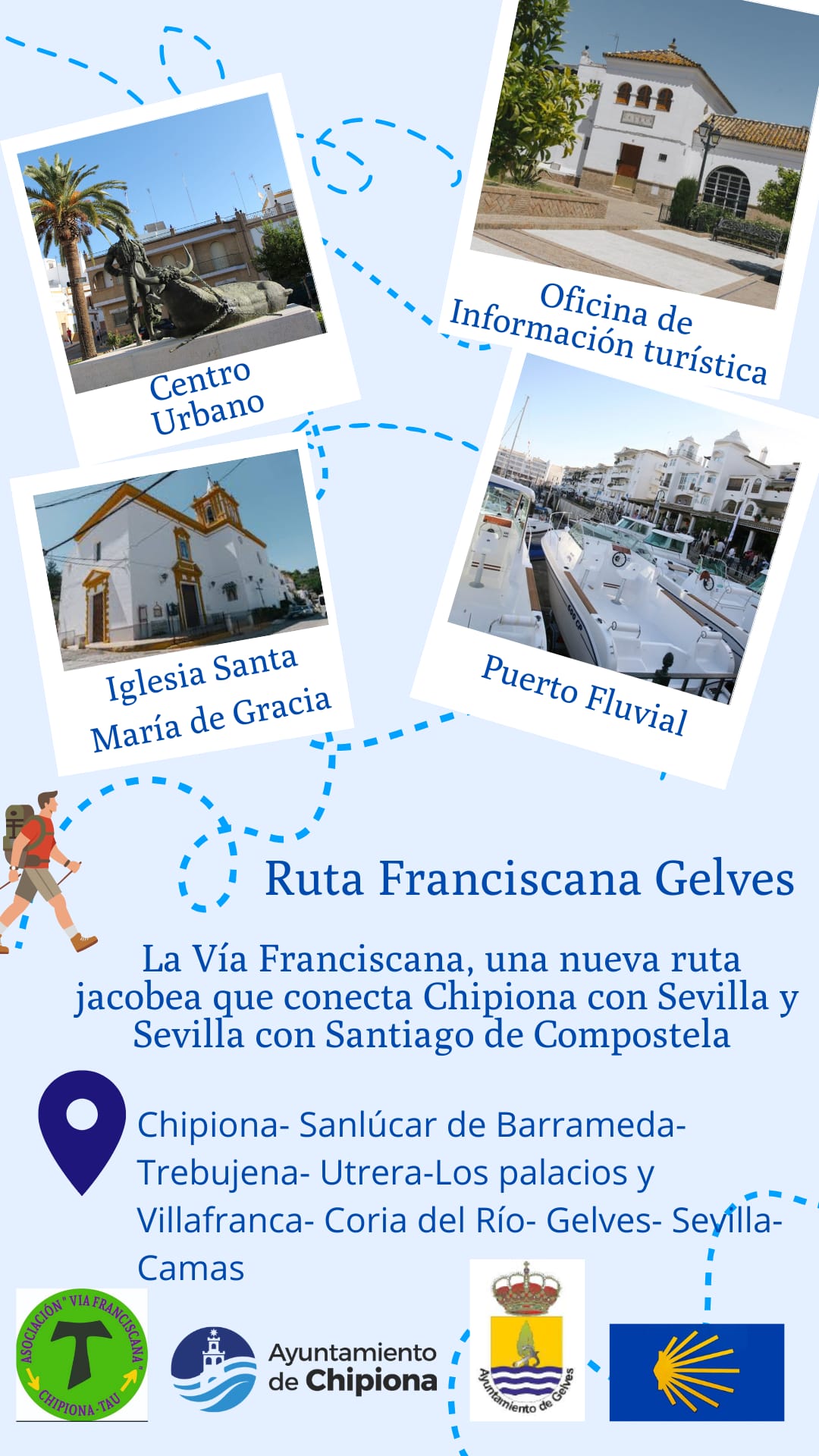 La alcaldesa de Gelves, Isabel Herrera, y la delegada municipal de Turismo, Isabel García Cardoso, han mantenido una reunión con la delegada de Deportes del Ayuntamiento de Chipiona, Laura Román, y el presidente de la Asociación de Amigos del Camino de Santiago "TAU", José Manuel Miranda, con la intención de formalizar la inclusión de Gelves en la Ruta Jacobea - Vía Franciscana. Una iniciativa que pretende ampliar el Camino de Santiago que une Sevilla con Santiago de Compostela, con seis etapas más entre Chipiona y Camas. Esta ruta dará promoción turística a nuestro municipio, ya que aportará gran parte de sus recursos a las personas que la realicen.