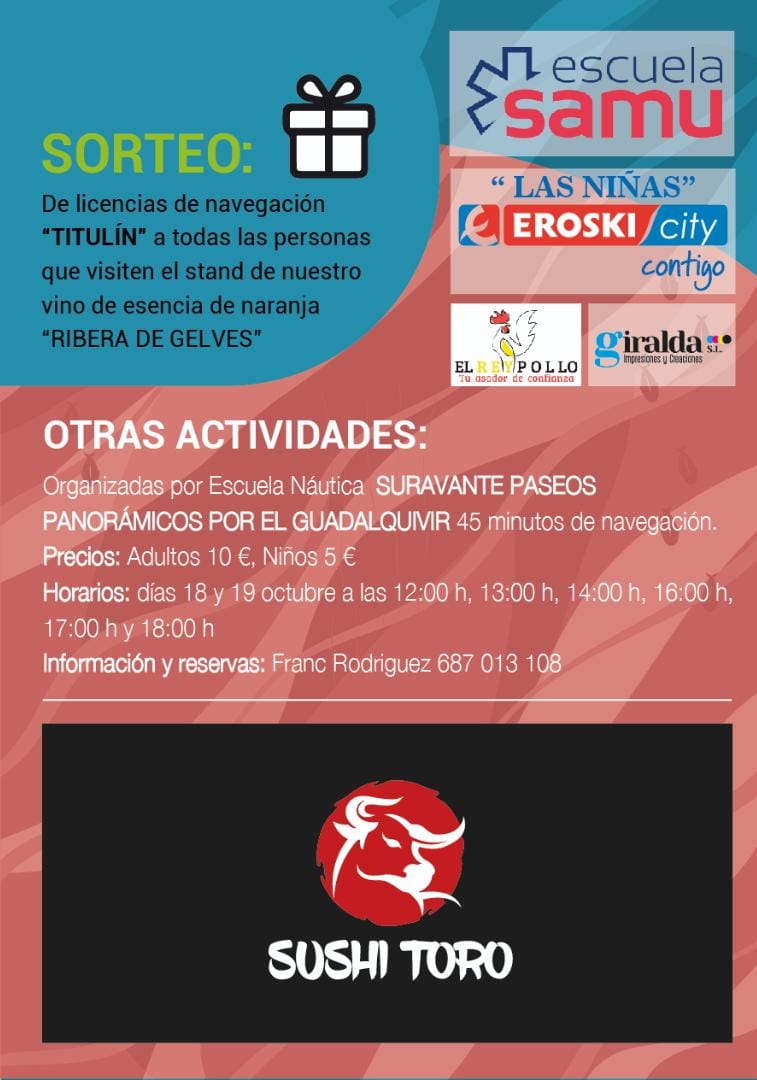 También se celebrará un sorteo de licencias de navegación “Titulín” entre quienes visiten el stand del vino de esencia de naranja “Ribera de Gelves”.