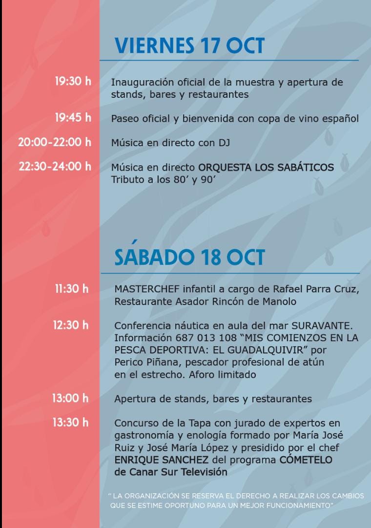 - 13:30 h Concurso de la Tapa y Concurso de Cocina Amateur, con jurado presidido por el chef Enrique Sánchez (Cómetelo, Canal Sur TV).