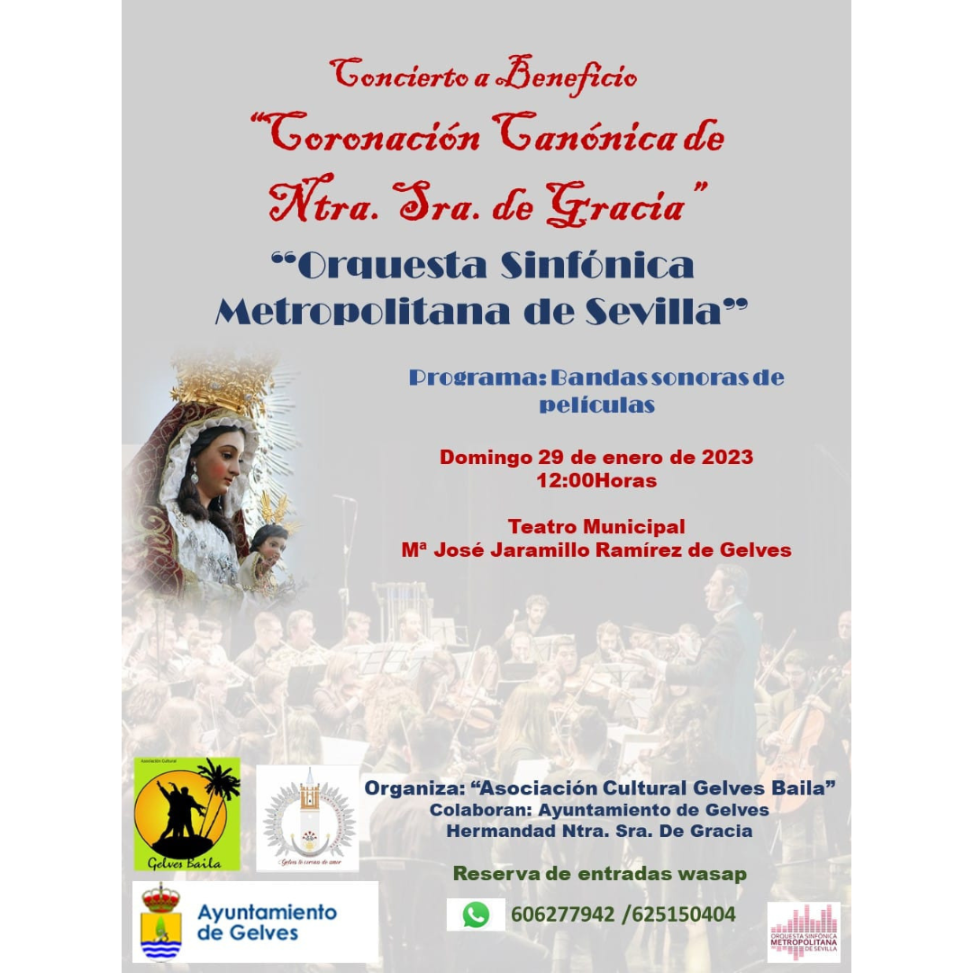 La Asociación Cultural Gelves Baila, en colaboración con el Ayuntamiento de Gelves y la Hermandad Ntra. Sra. de Gracia, ha organizado un Concierto de la Orquesta Sinfónica Metropolitana de Sevilla, para el próximo 29 de enero de 2023 a las 12.00 h. en el Teatro Municipal "María José Jaramillo Ramírez" de nuestra localidad. La orquesta, dirigida por Pedro Vázquez, ofrecerá un repertorio basado en bandas sonoras de películas, con una duración de 1:30 h.