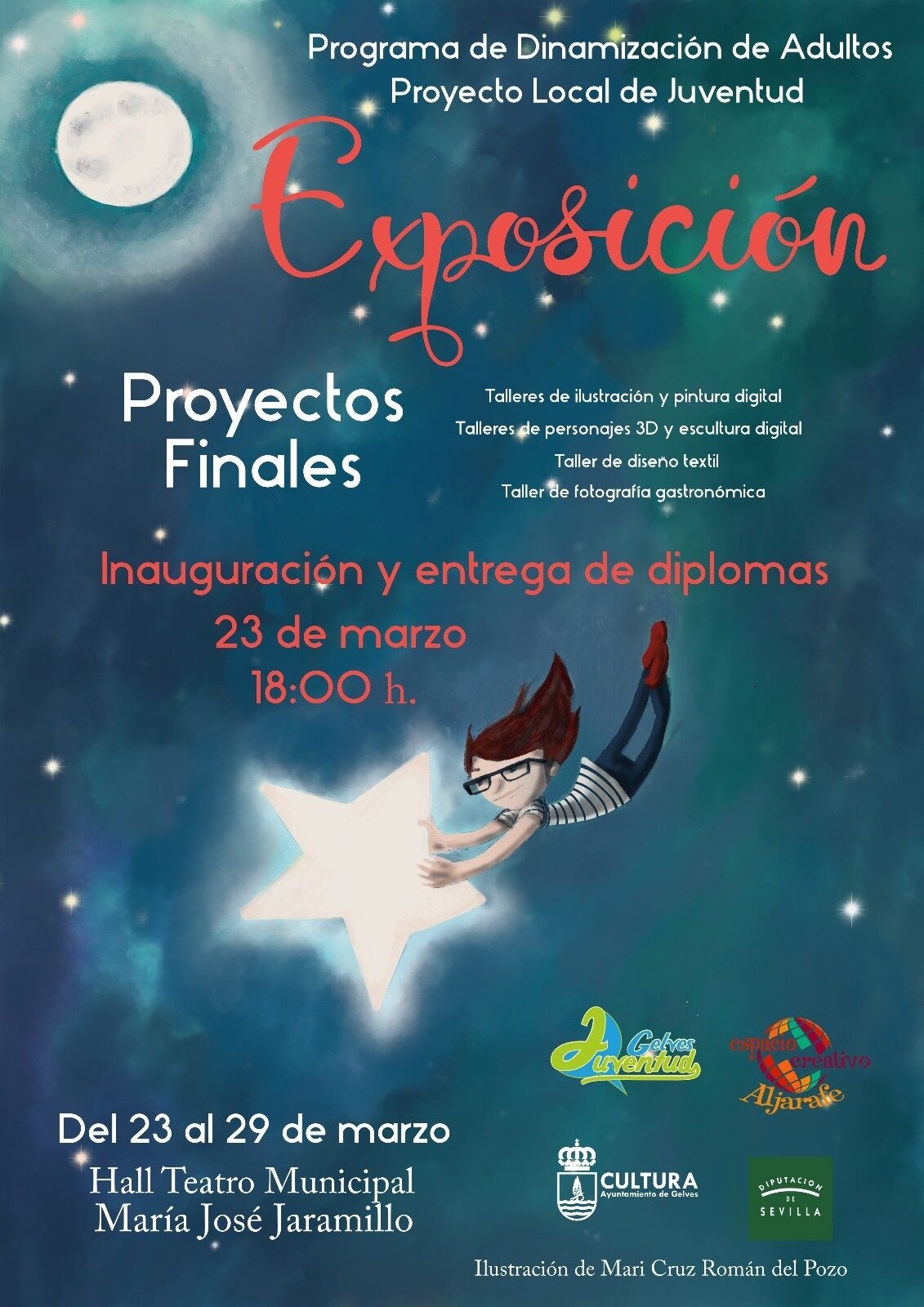 El hall del Teatro Municipal “María José Jaramillo Ramírez” de Gelves albergará desde el 23 al 29 del presente mes de marzo una exposición de los proyectos finales de los talleres desarrollados en la Biblioteca Municipal “Antonio Álvarez López” en los últimos meses y organizados por las delegaciones de Cultura y Juventud del Ayuntamiento de Gelves. Concretamente estas acciones pertenecen al Programa de Dinamización de Adultos y el Proyecto Local de Juventud y se han centrado en temas tan diversos como la “Ilustración y pintura digital”, los “Personajes 3D y escultura digital”, el “Diseño textil” y la “Fotografía gastronómica”.