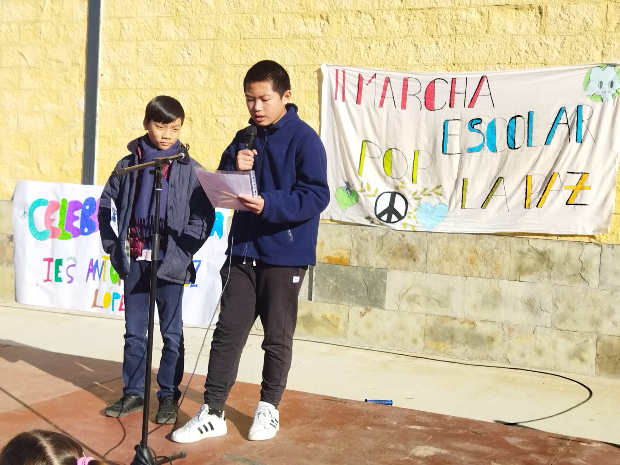 El acto comenzó con una concentración de más de 500 alumnos/as de infantil, primaria y secundaria, cuyos representantes dieron lectura a varios manifiestos en favor de la Paz, haciendo alusión en la mayoría de los casos a Mahatma Gandhi, dirigente indio más destacado del movimiento de independencia de la India contra el Raj británico, que se caracterizó por practicar la desobediencia civil no violenta, además de ser pacifista, político, pensador y abogado hinduista.