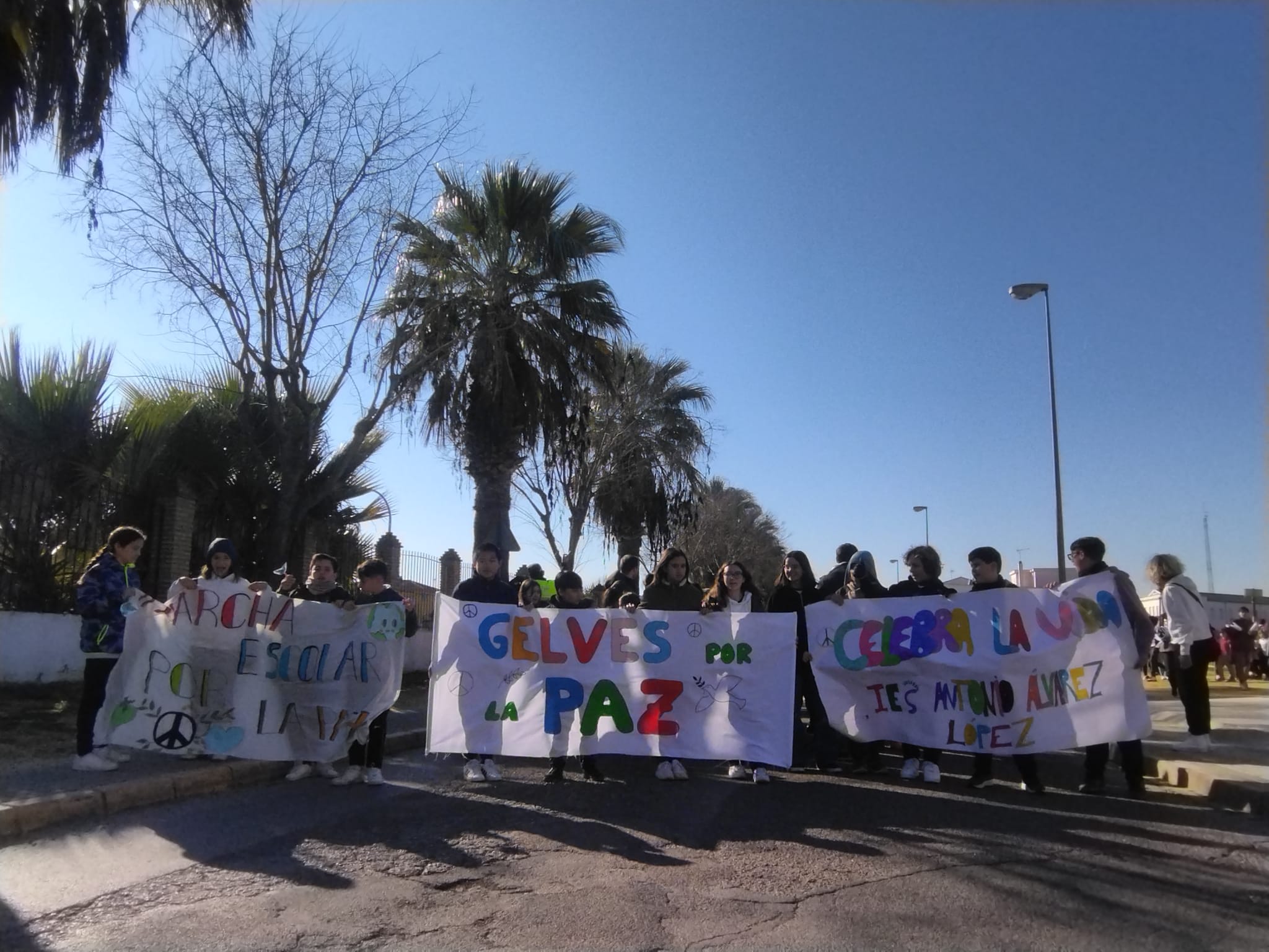 Coincidiendo con el Día Escolar de la No Violencia y la Paz que se celebraba ayer lunes 30 de enero, alumnado y profesorado de los tres centros educativos de Gelves, capitaneados por el Ayuntamiento, protagonizaron en la mañana de ayer la II Marcha Escolar por la Paz. Después de dos años sin poder celebrar esta actividad a causa de la pandemia, la Delegación Municipal de Educación junto a los centros CEIP Dª Rosa Fernández, CEIP Duques de Alba e IES Antonio Álvarez López organizaron esta marcha que se inició en el recinto ferial y finalizó en la plaza Duque de Alba.