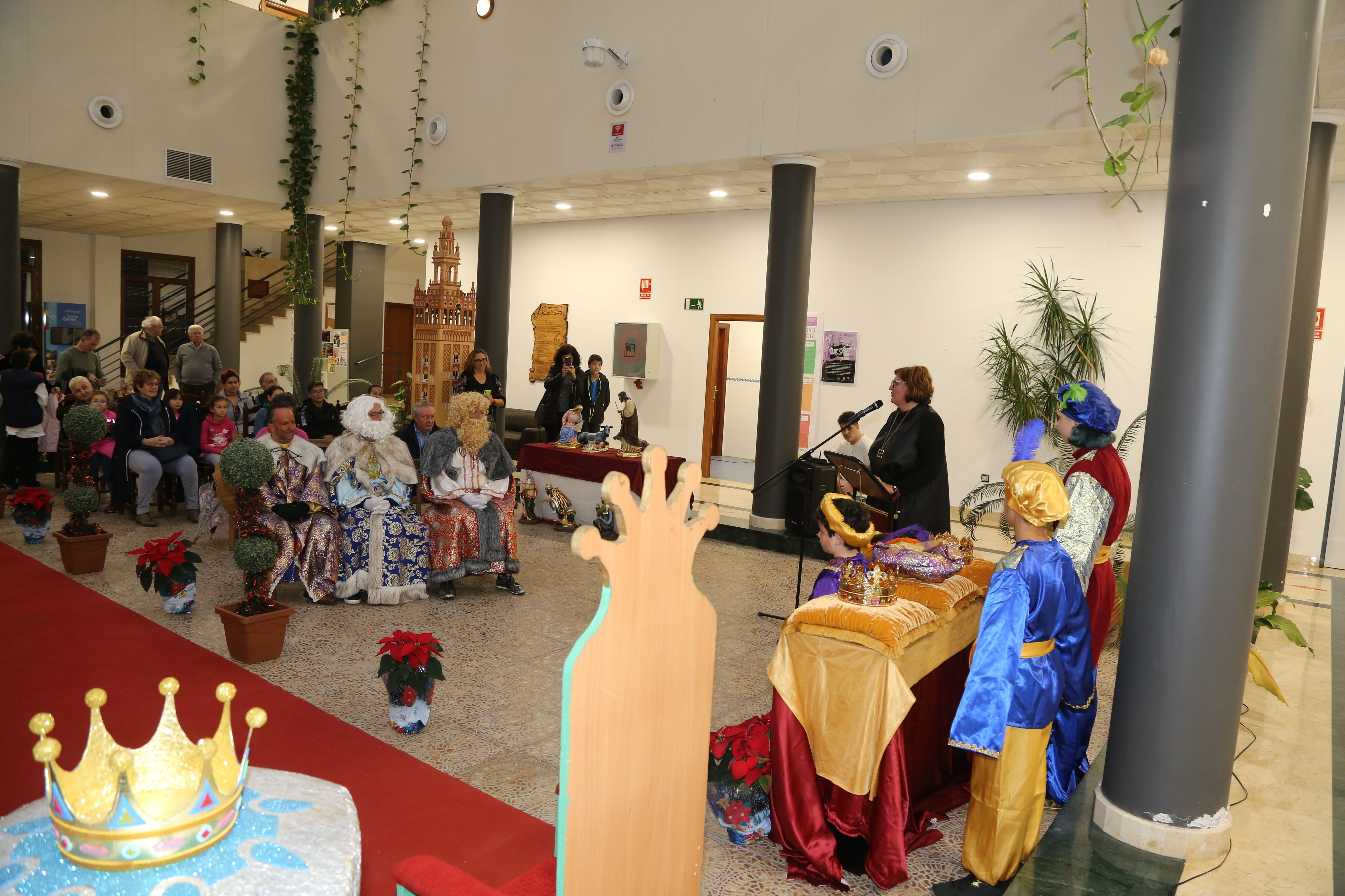 El patio central del Ayuntamiento acogió en la tarde de ayer el Acto de Coronación de los Reyes Magos de Oriente que, junto a las vestimentas recibidas el pasado 23 de noviembre, lucirán durante los actos organizados para la presente Navidad 2022-23. El acto contó con las intervenciones de la alcaldesa de Gelves, Isabel Herrera, encargada de colocar las coronas, y la presidenta del Ateneo de Gelves, Irene Bernal. Tras los discursos se sirvió una merienda Real a las personas asistentes.