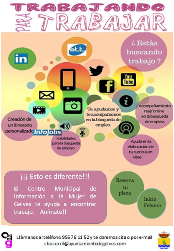 El Centro Municipal de Información a la Mujer de Gelves (CMIM) va a poner en marcha en el presente mes de febrero un taller de empleabilidad denominado “Trabajando para trabajar”. Dirigido principalmente a mujeres que se encuentren en búsqueda “activa” de empleo, tiene como objetivo aumentar su empleabilidad mediante diferentes itinerarios socio-laborales, que les proporcionarán un mayor conocimiento personal y profesional.