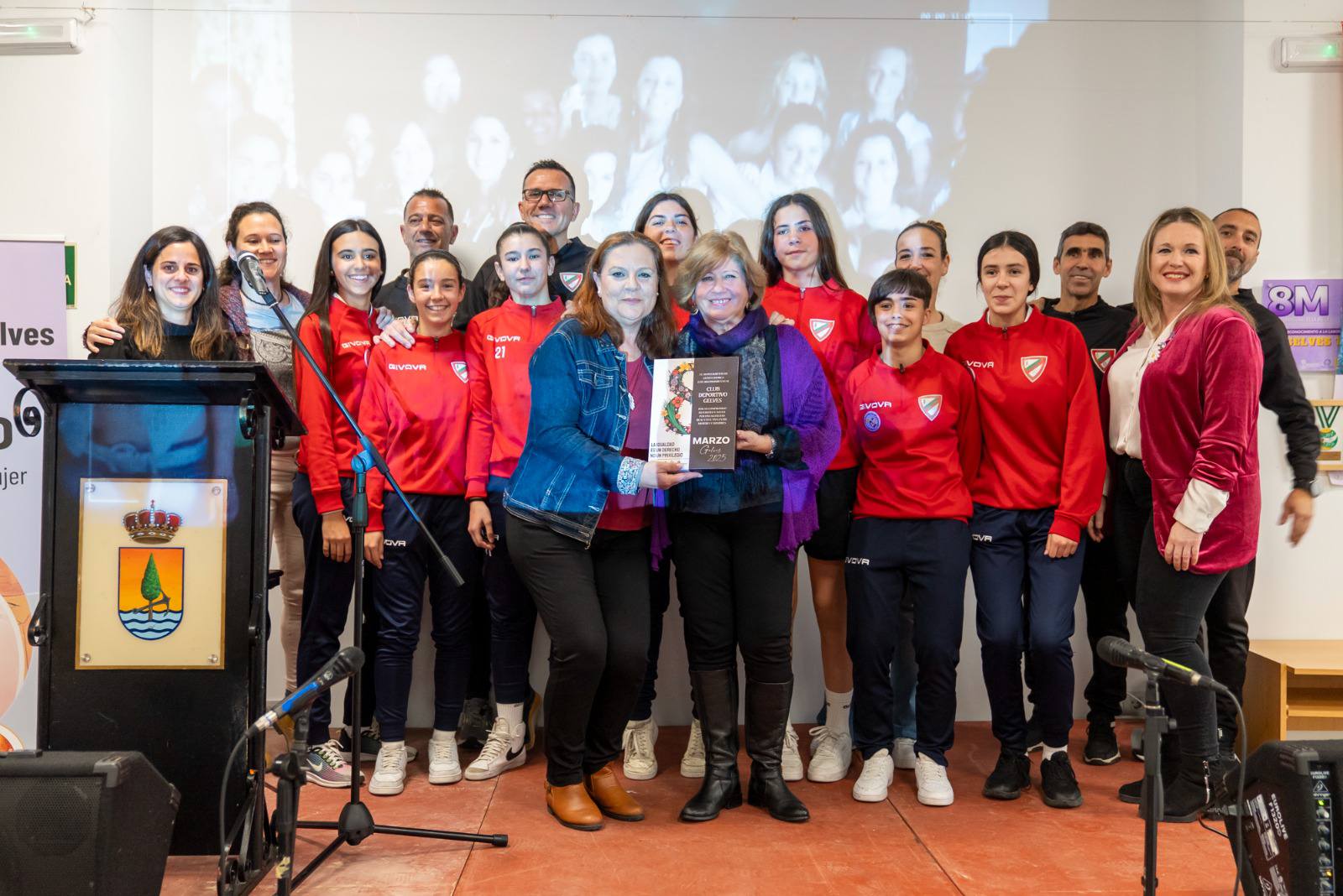 A continuación, tuvieron lugar los reconocimientos, en esta ocasión dedicados a Francisca Caraballo Monge (Presidenta de la Asociación de Mujeres Fibrogelduba) y al Club Deportivo Gelves. En el caso de Francisca recogió su reconocimiento debido a su trayectoria como mujer, involucrada en el ámbito social, escritora y entregada al sector asociativo. Con respecto al Club Deportivo Gelves, se le reconoció como el único club que había puesto en marcha el proyecto promovido por la Delegación de Igualdad titulado "Charlas de Vestuario". Un proyecto que se encargaba de integrarse dentro del propio club y sus equipos para contagiar un ambiente igualitario y respetuoso. Además se hizo un recorrido por la historia del club en su apuesta por la presencia femenina en sus equipos. Asistió una representación de estos equipos, encargada de recoger la conmemoración y acompañada de otros miemrbos de la directiva actual.