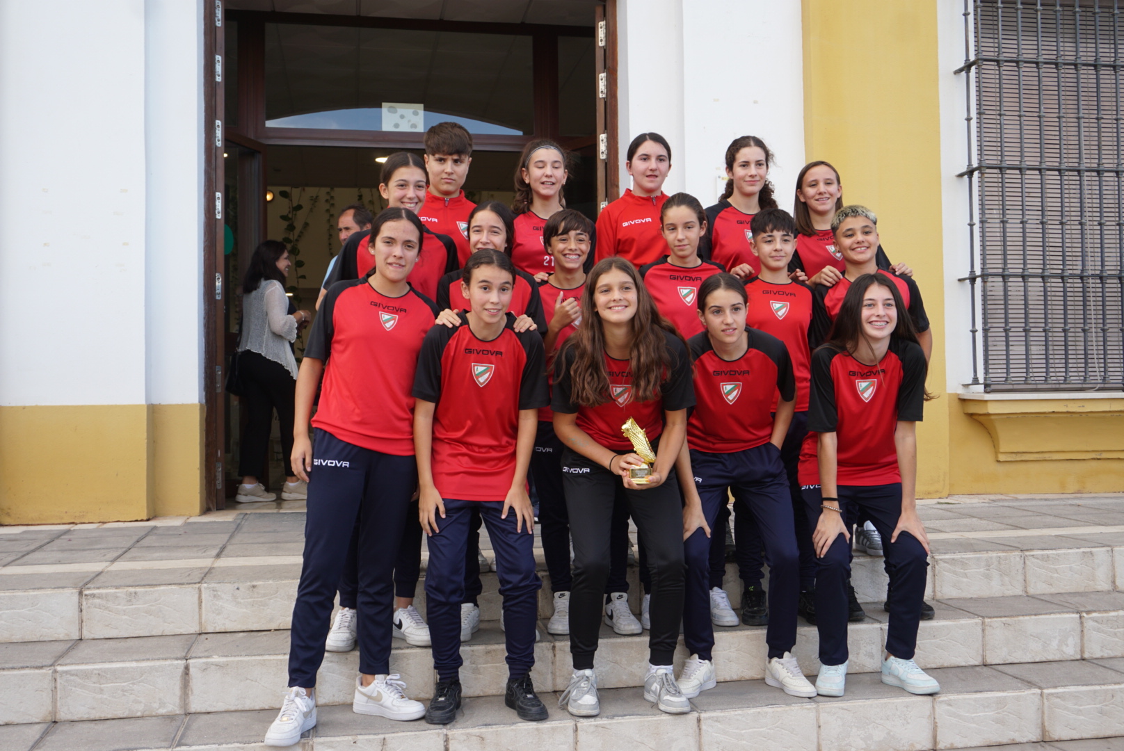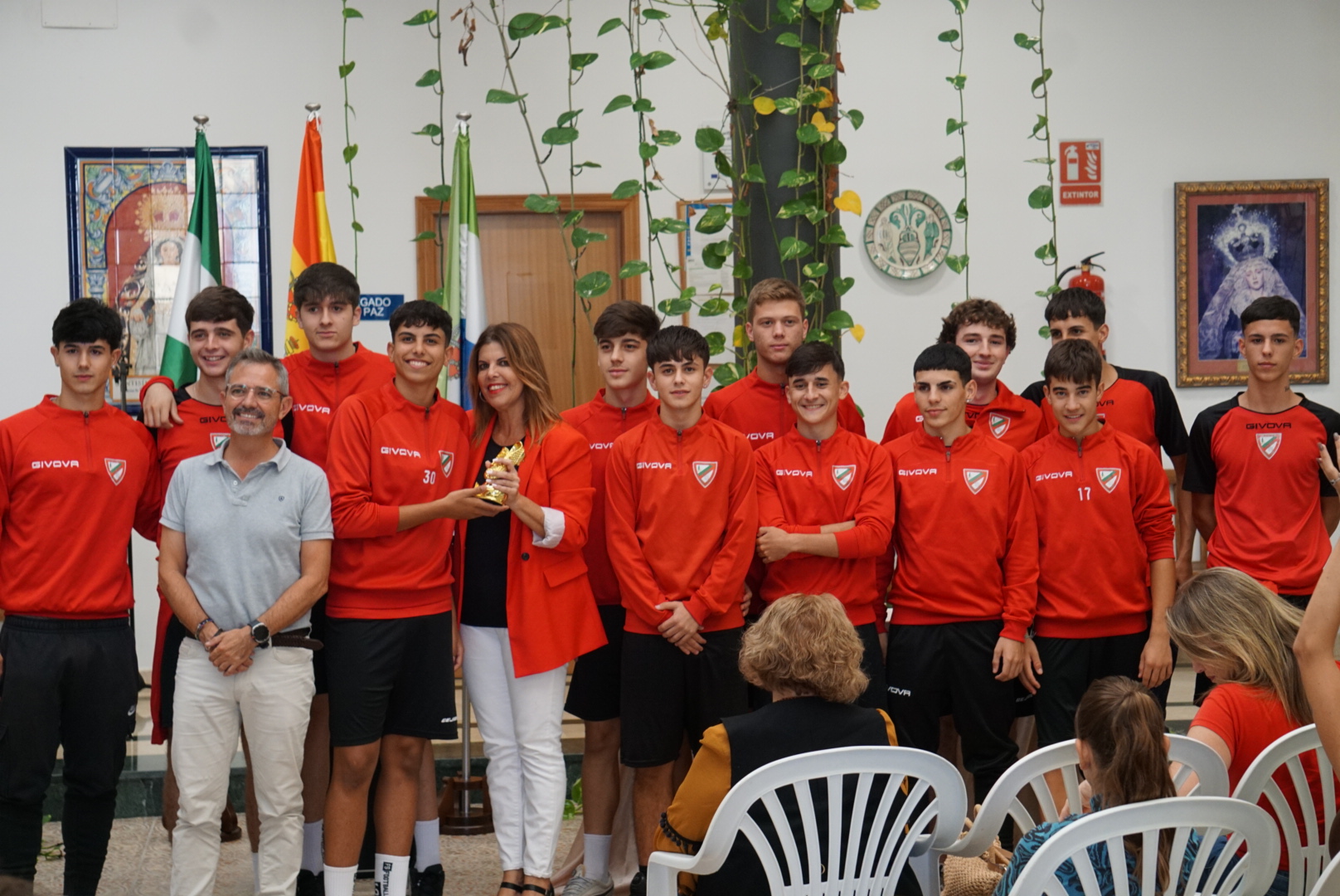 En el evento, la alcaldesa, Isabel Herrera, estuvo acompañada por el Delegado de Deportes, David Mir; la Delegada de Igualdad y Diversidad, Mariló González; y la Delegada de Turismo, Isabel García. Herrera, tras hacer entrega al equipo cadete femenino destacó la importancia de la igualdad en el deporte “rey”, además de mostrar su alegría por recibir en la sede del Ayuntamiento a los/as deportistas. También defendió la alcaldesa la importancia de visibilizar, con estos actos, el esfuerzo, el trabajo, y la dedicación de los/as jugadores/as, sus entrenadores/as, sus familiares y la Junta Directiva del C.D. Gelves.