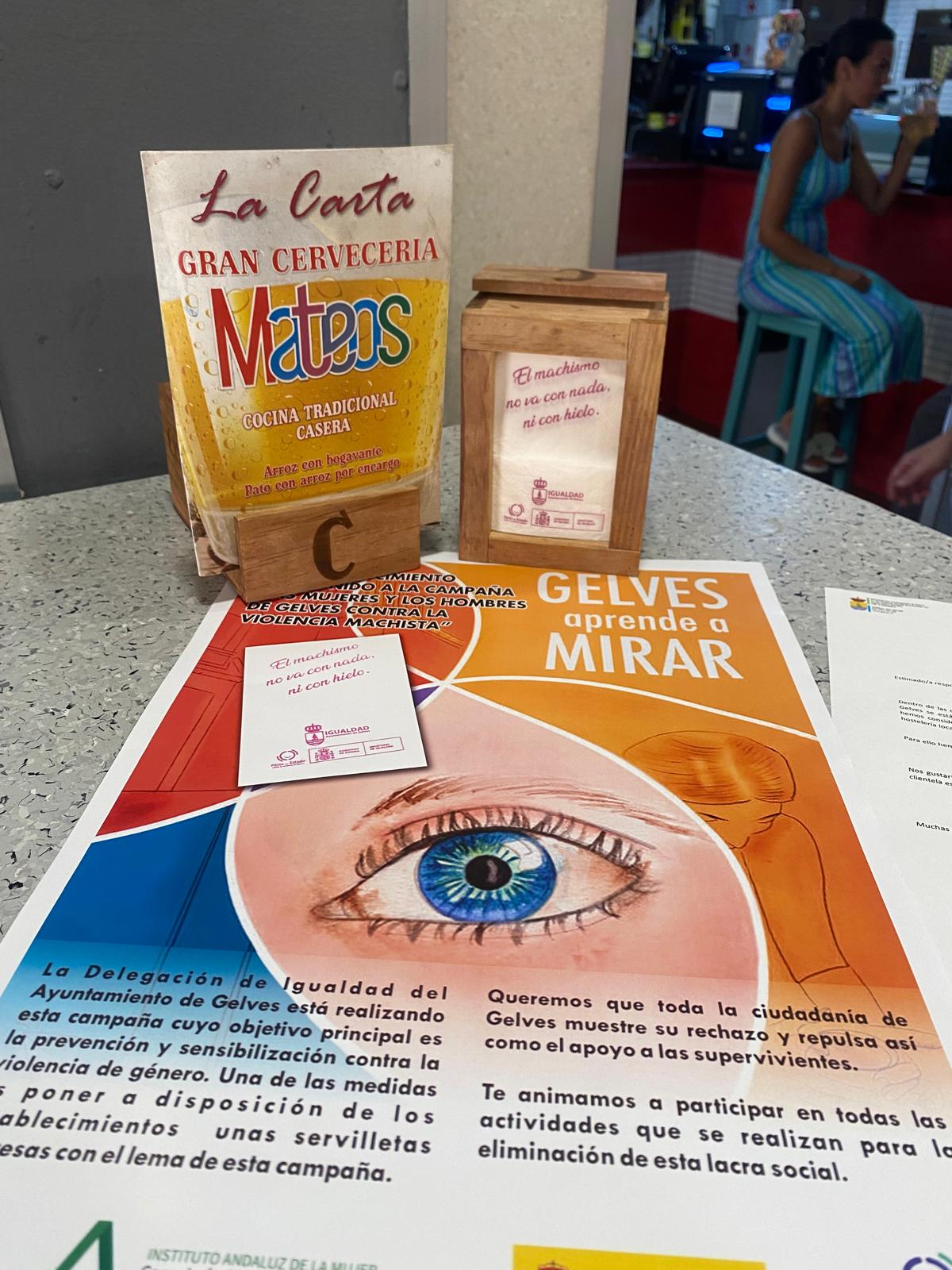La Delegación de Igualdad y el CMIM de Gelves distribuyen cerca de 5.000 unidades a 29 establecimientos hosteleros para dar visibilidad y sensibilizar contra la violencia de género en espacios de ocio.