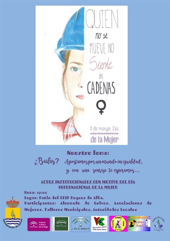 o Por la tarde a las 17:00 h. en el patio del CEIP Duques de Alba se celebrará el Acto Institucional donde habrá: intervenciones del alumnado de los centros educativos de Gelves, entrega de los Reconocimientos Anuales a la Igualdad 2017, lectura teatralizada por parte de integrantes de la Asociación de Mujeres “Fibrogelduba”, e intervenciones de los representantes de los grupos políticos municipales. El fin de acto será algo diferente: una sorpresa relacionada con el mundo del baile.