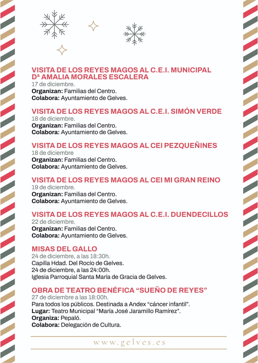 Las delegaciones de Fiestas Mayores, Fiestas Menores y Eventos del Ayuntamiento de Gelves, en colaboración con el resto de áreas municipales, han vuelto a editar un año más el Programa de Actividades Navideñas organizadas tanto por el Consistorio como por las distintas asociaciones, hermandades, entidades y centros educativos de nuestra localidad. Un programa que se extiende hasta el próximo 6 de enero y que muy pronto llegará a todos los domicilios gelveños. Mientras tanto se puede consultar en nuestra web y redes sociales municipales.