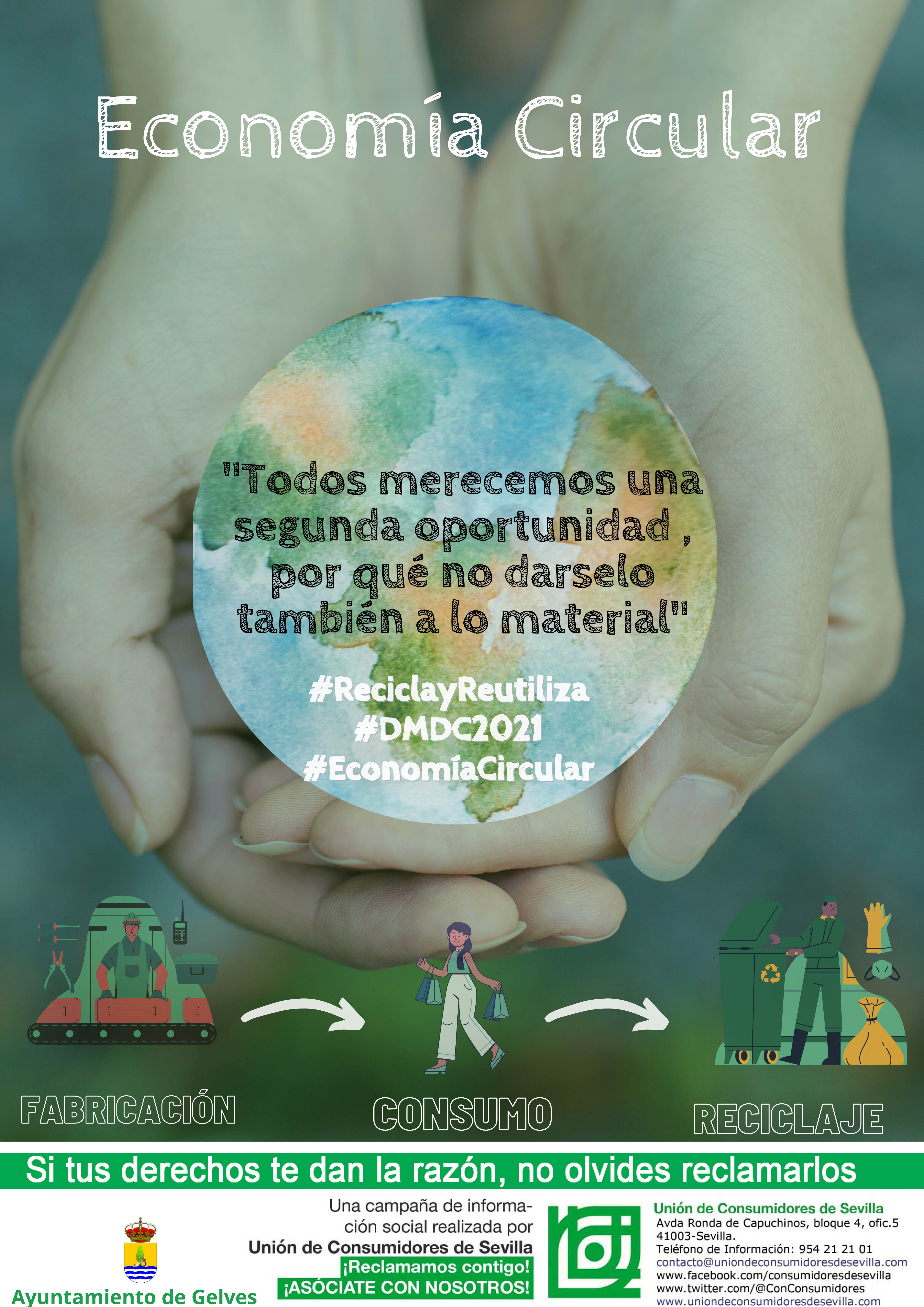 El Ayuntamiento de Gelves ha decidido sumarse este año a la Campaña promovida por la Unión de Consumidores de Sevilla UCS, con la que mantiene un convenio de colaboración en materia de Consumo. Este tipo de campañas pretenden concienciar y sensibilizar a la población consumidora de sus derechos y necesidades a nivel mundial. La campaña de este año coincide con el 15 de Marzo, DÍA MUNDIAL DE LOS DERECHOS DEL CONSUMIDOR, y va dedicada a la ECONOMÍA CIRCULAR, cuyo principal objetivo es reducir tanto la entrada de los materiales vírgenes como la producción de desechos, ya que según Ecoembes "la economía circular es la producción de bienes y servicios al tiempo que reduce el consumo y el desperdicio de materias primas, agua y fuentes de energía".