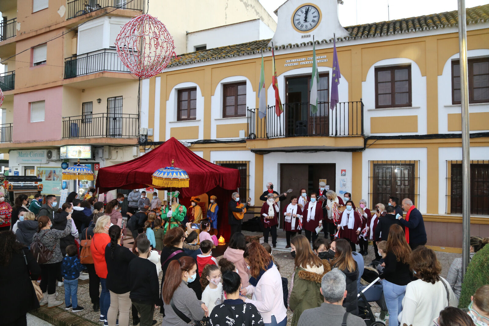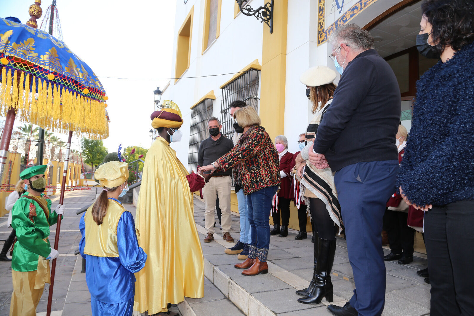 El Ayuntamiento se muestra muy satisfecho con la excelente acogida recibida ayer en una de las actividades organizadas por su Delegación de Fiestas y Eventos para esta Navidad: el Cartero Real. Puntual a su cita con las familias gelveñas, el ilustre mensajero acompañado de su séquito llegó a las cinco de la tarde en coche de caballos al Consistorio, donde ya había mucho público esperándolo. Entre ellos, la alcaldesa de Gelves, Isabel Herrera, acompañada de varios miembros de su equipo de gobierno, que fue la encargada de hacerle entrega de las llaves de la localidad. También contó la actividad con la actuación del Coro de Campanilleras/os del Centro de Educación de Personas Adultas de Gelves, que fue acompañando al séquito durante todo su recorrido.