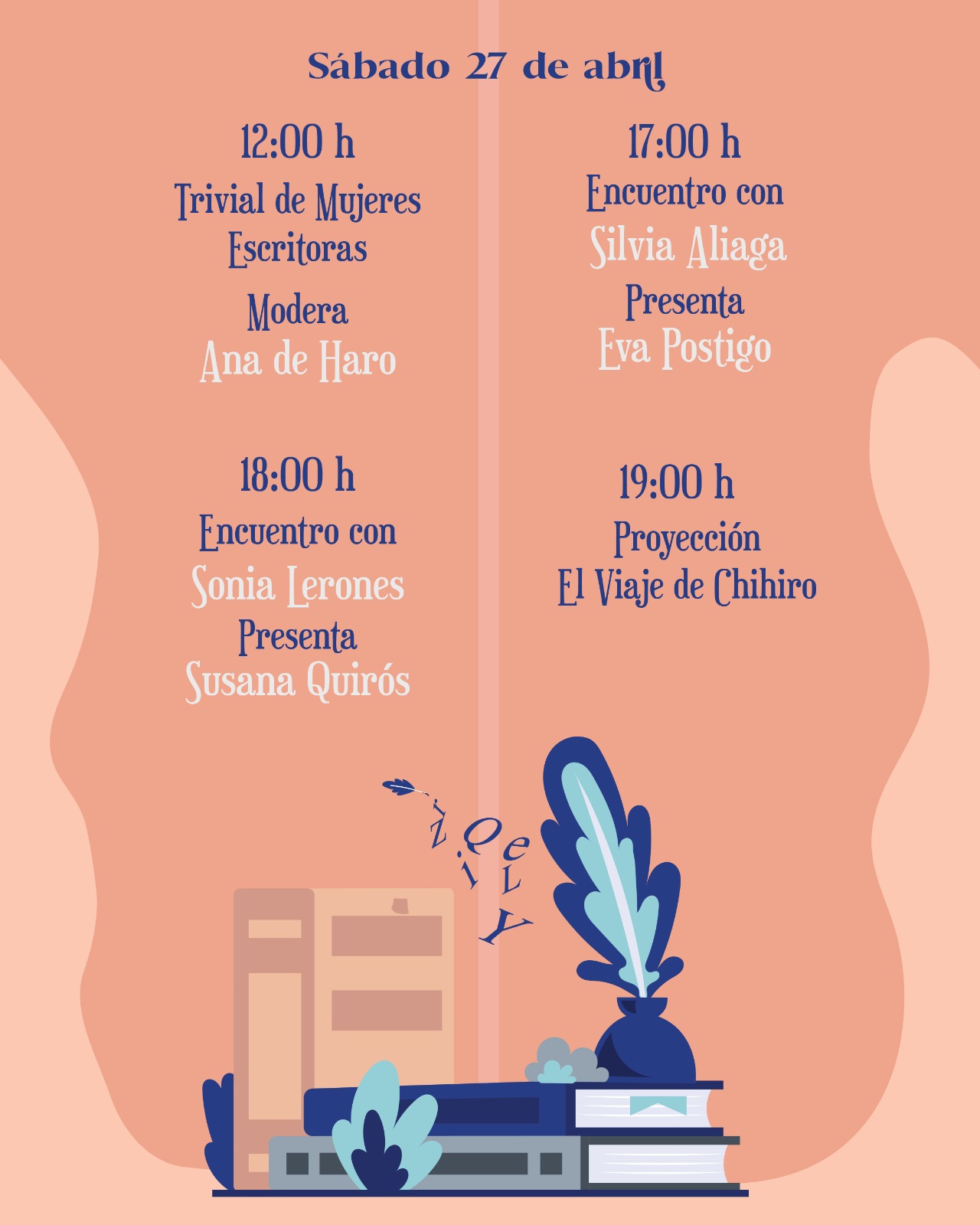 En este 2024 presenta un programa muy completo e interesante que incluye encuentros con autoras de diversos estilos y géneros como Lara Lox, María José Vicente Cherry Chic, Nerea Llanes Sonia Lerones y Silvia aliaga. También habrá mesas redondas sobre Harry Potter, autoras de Gelves (Ángela Martínez Rodríguez y María Martín Estévez), y sobre autoras de Novela Negra (Paola Boutellier y May R Ayamonte). También disfrutarán las personas asistentes de un podcast en directo sobre literatura de terror, con la participación de Irra Jiménez (locutor de Ahora Radio), Susana Quirós (escritora, youtuber y organizadora del evento), y Ana de Haro (escritora y periodista). Otras novedades importantes son: el Trivial de Mujeres Escritoras que moderará Ana de Haro y la proyección de “El Viaje de Chihiro” durante la última jornada del sábado 27 de abril.