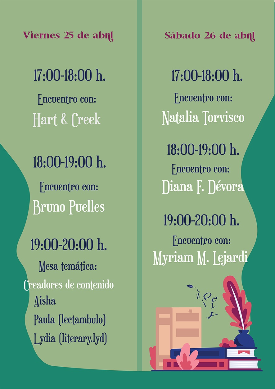 Este año se presenta con muchas ganas, apostando por este tipo de público tanto en los/as autores/as que estarán presentes en el evento, como en el programa de actividades que ofrecerá a sus asistentes. Para empezar, encabezan el cartel autores/as como: Bruno Puelles, Diana F. Débora, Myriam M. Lejardi, Aurora Hart y Natalia Torvisco. También contará con la participación de dos autores locales: Jesús Villarán Velasco y Juan López Iglesias. Con todos/as ellos/as habrá encuentros para conocer mejor sus trayectorias y/o novedades, según los casos.