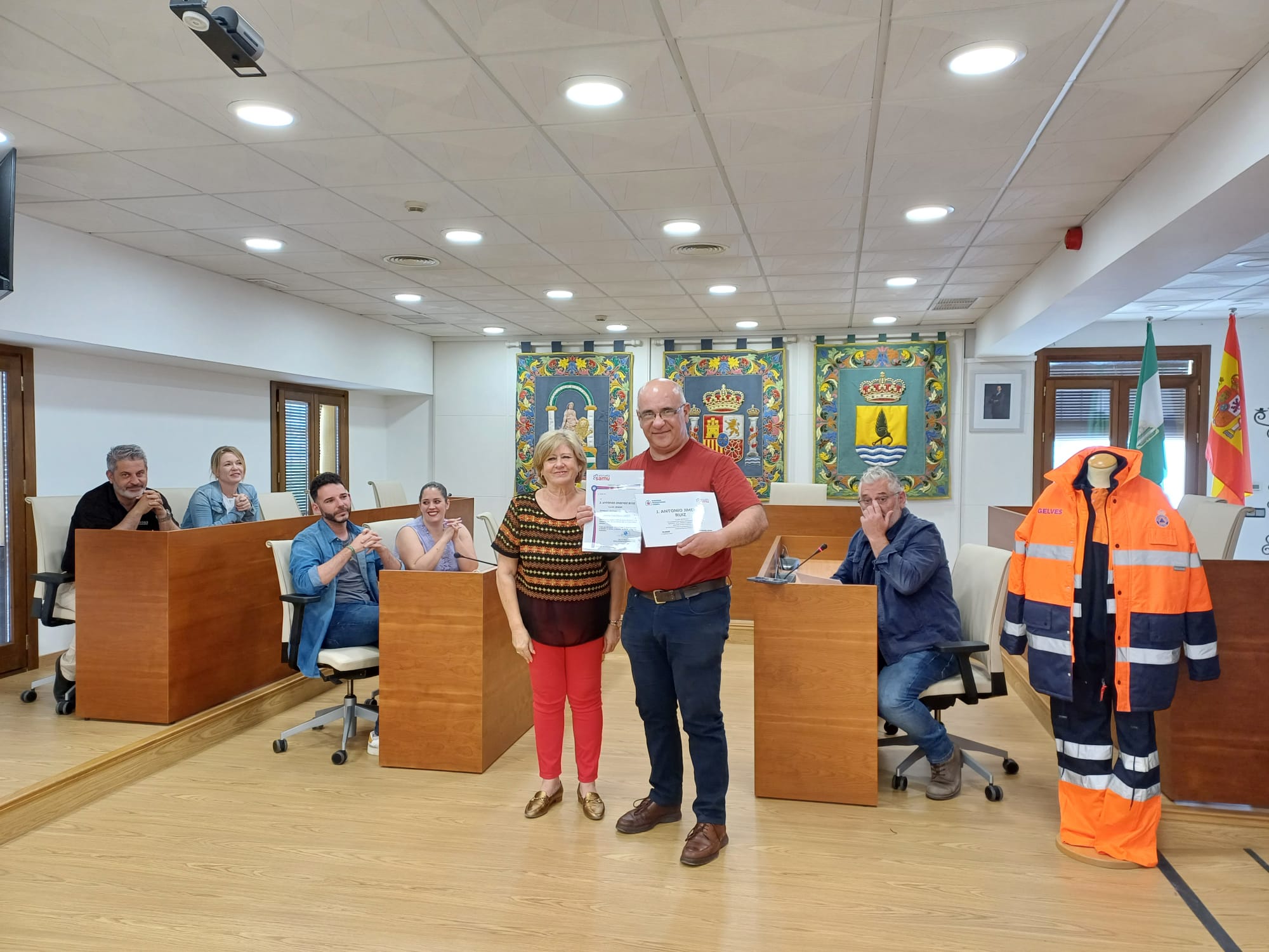 La alcaldesa de Gelves, Isabel Herrera, hizo entrega el pasado viernes a las personas voluntarias de la Agrupación Local de Protección Civil de los diplomas acreditativos por su participación en el curso de “Prevención e Intervención en Primeras Emergencias”, impartido el pasado 17 de febrero por la Escuela de Emergencias SAMU. Ésta ha sido la primera de las acciones formativas que recibirán antes de iniciar su actividad coordinada por la Delegación Municipal de Seguridad Ciudadana. Su titular, Rafael García Villa, aseguró que “nuestra intención es ir dotándolos/as de conocimientos y habilidades de cara a ampliar su capacidad de actuación. De hecho, ya estamos trabajando con SAMU en la siguiente formación que se desarrollará en breve”. Según el delegado, “es necesario que sepan conocer e identificar los tipos de riesgos que se pueden encontrar en una situación de emergencia, así como saber realizar eficazmente sus labores de actuación en dispositivos y de apoyo a otros cuerpos de seguridad”.