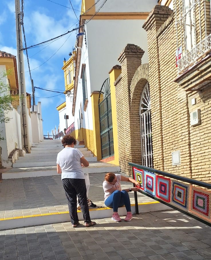 Continuando con el Proyecto Gelves Teje, las mujeres tejedoras han decorado con mandalas en forma de cuadrado las rejas y barandilla de la calle Eladio Ramos así como la escalinata aledaña.