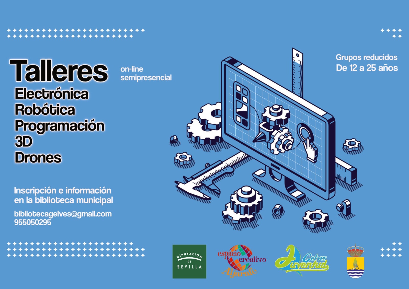 Diseño, Juegos Creativos, Electrónica, Robótica, Programación, 3D y Drones, además de Audiovisual, son las opciones ofrecidas. Interesados/as contacten con la biblioteca municipal a través de bibliotecagelves@gmail.com o llamando al 955 050 295.
