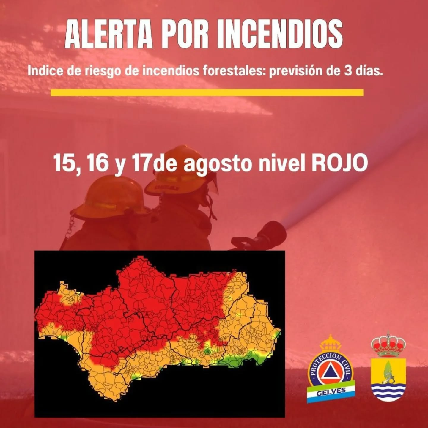 El Ayuntamiento de Gelves junto a Protección Civil de Gelves informan y advierten sobre la necesidad de extremar las precauc iones durante los días 15, 16 y 17 de agosto debido a que continúa el alto riesgo de incendio: Nivel rojo