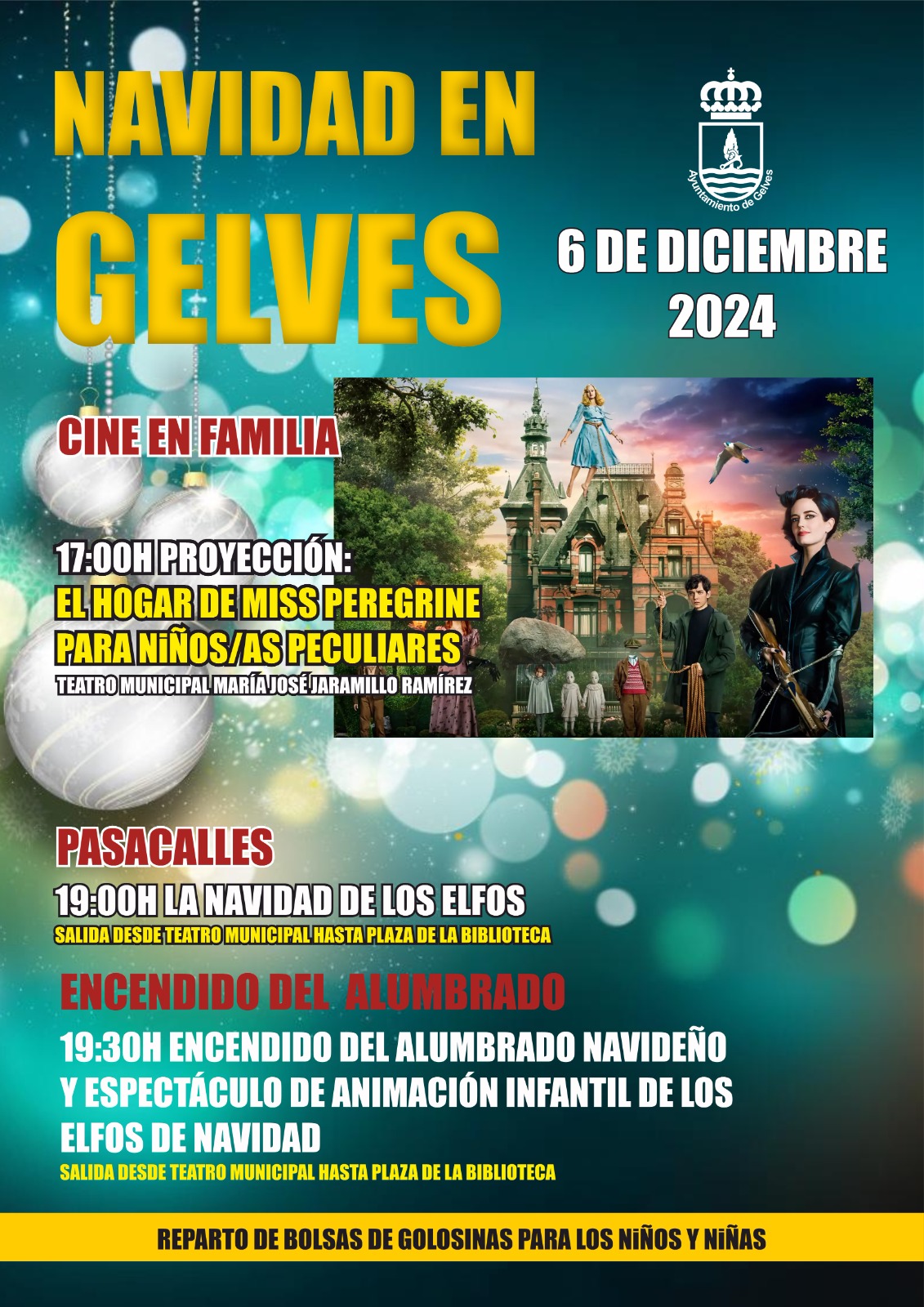 Habrá cine en familia, pasacalles y espectáculo de animación infantil de los Elfos de Navidad, además de reparto de golosinas para niños/as, a partir de las 5 de la tarde.