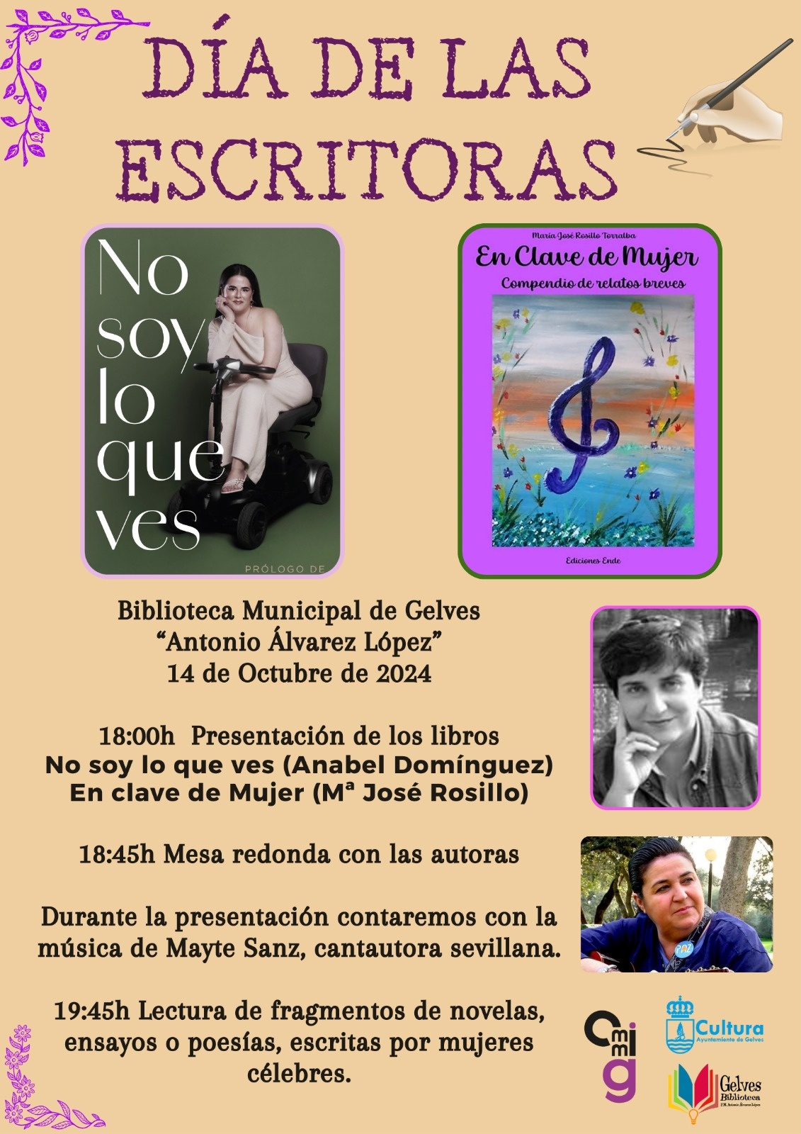 A partir de las 18:00h habrá presentación de dos libros escritos por mujeres de Gelves y San Juan de Aznalfarache, mesa redonda sobre este día y lectura de fragmentos de escritos por mujeres.