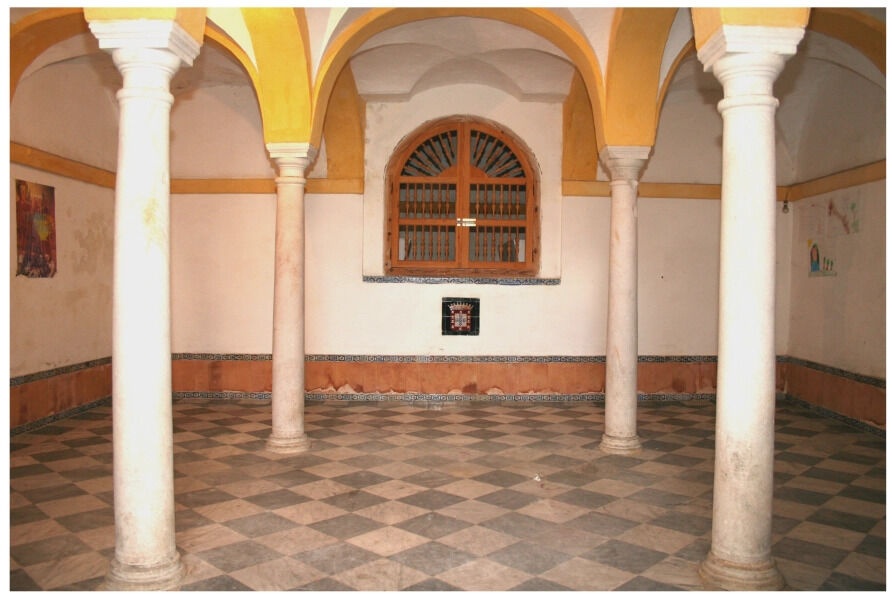 El banco está decorado con un bello azulejo que representa La Anunciación, obra del artista local Emilio Fernández Sevilla realizada en el siglo XX. A ambos lados del altar existen sendas puertas de doble hoja que da acceso a la sacristía (antiguo taller).